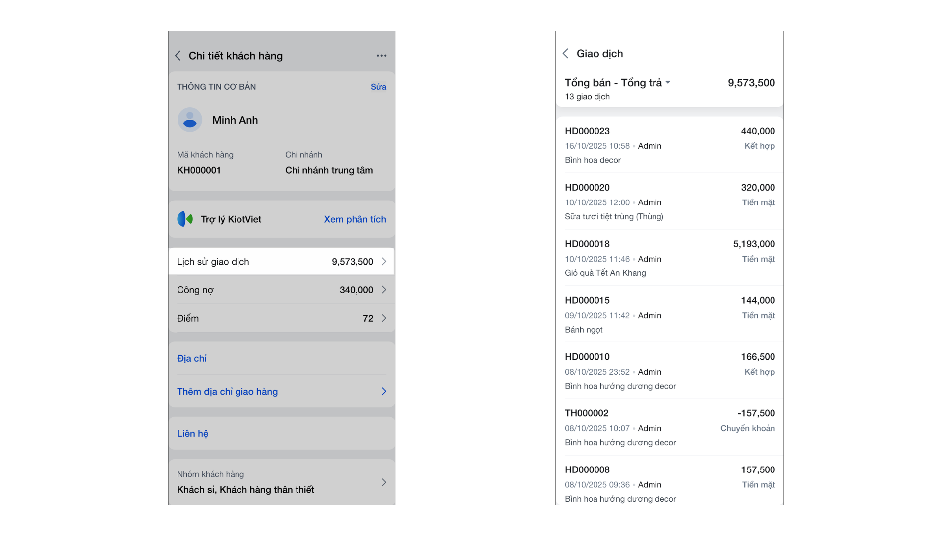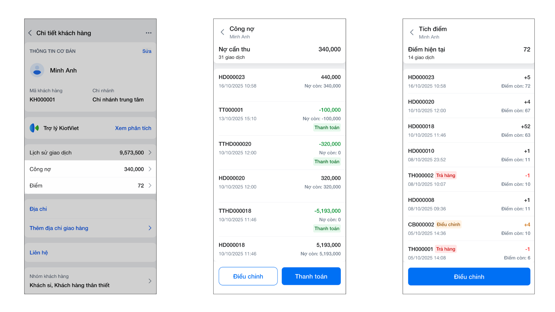 2. Quản lý Lịch sử giao dịch, Công nợ và Tích điểm