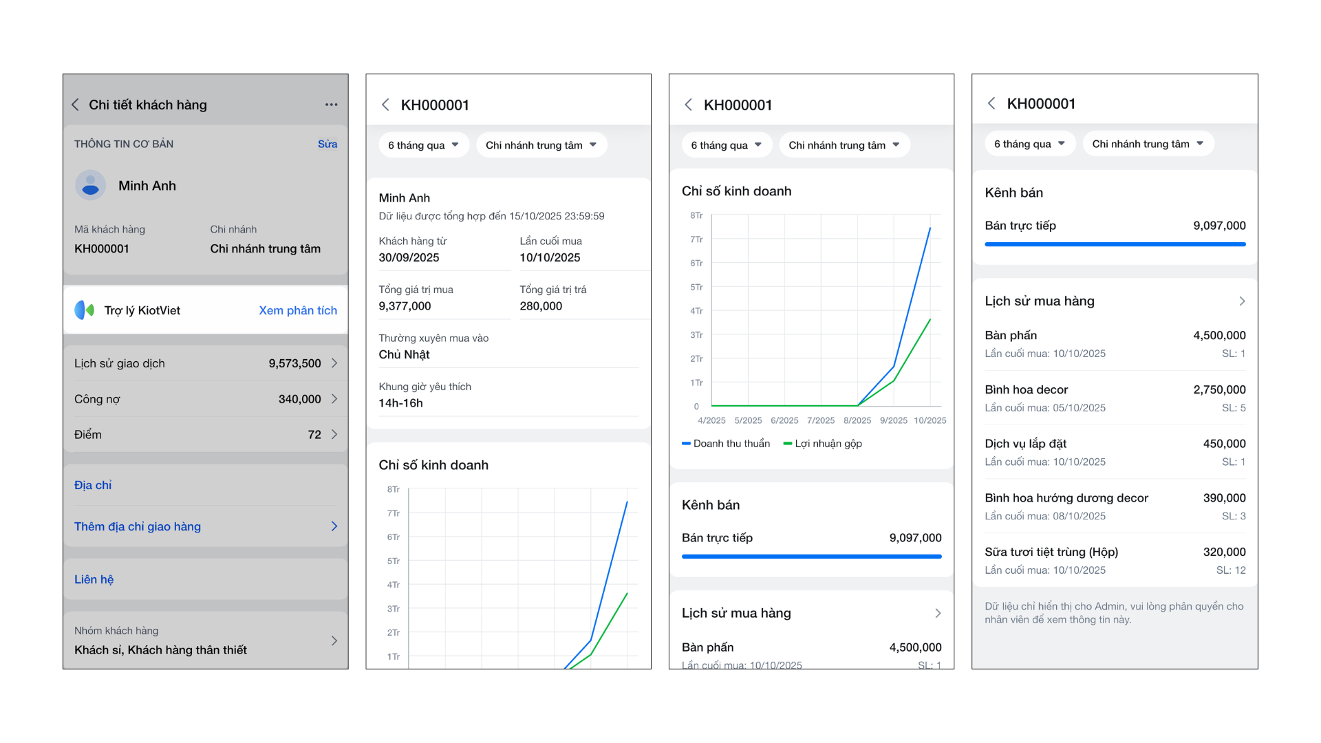 - Tình huống: Bạn muốn xem nhanh các chỉ số kinh doanh quan trọng của một khách hàng cụ thể.