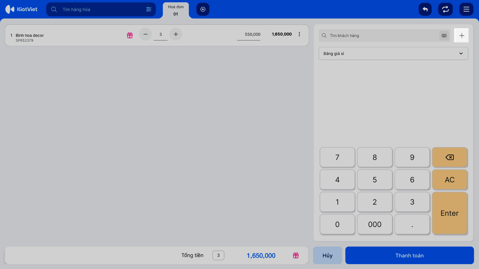 Ứng dụng KiotViet trên KiotViet Máy bán hàng tập trung vào thao tác bán hàng nhanh tại quầy.