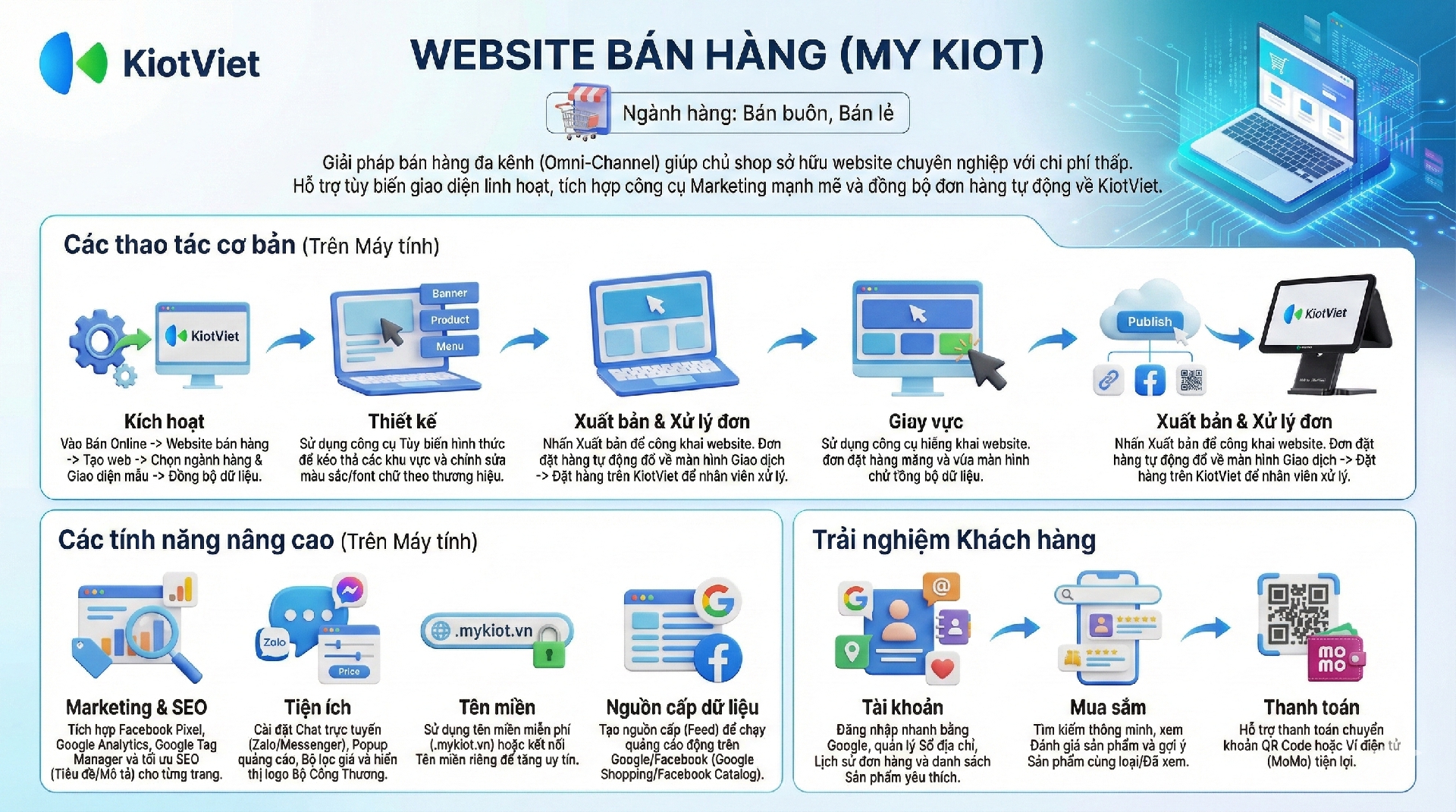– My Kiot cung cấp các công cụ tùy biến giúp khách hàng có thể sử dụng để thiết lập nội dung cũng như cách hiển thị nội dung đó trên website một cách linh hoạt và sáng tạo.