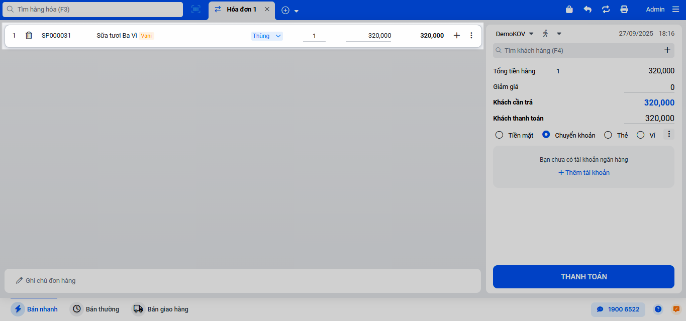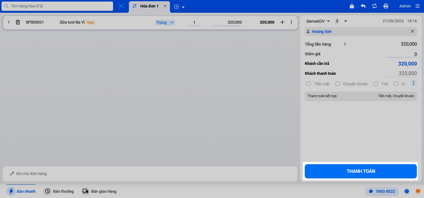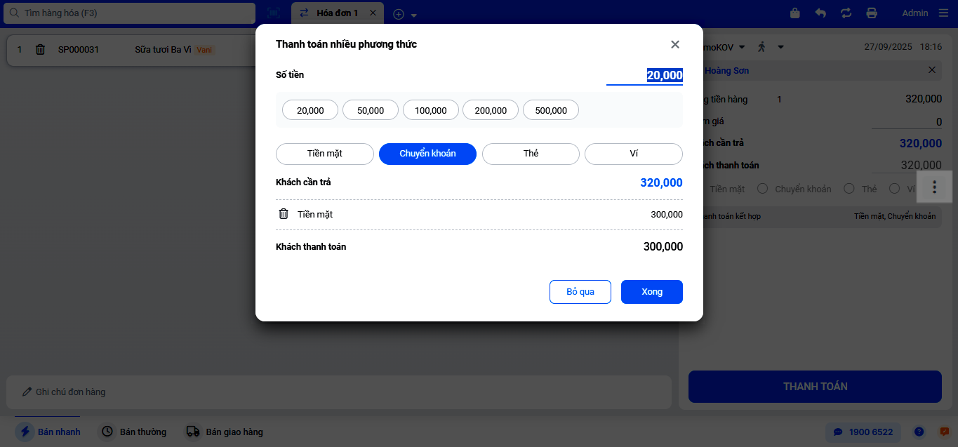 - Tình huống: Khi bạn cần bán hàng cho một khách mới và khách muốn thanh toán bằng nhiều phương thức. Ví dụ, khách mua một thùng “Sữa tươi Ba Vì – Vani” giá 320.000đ, thanh toán 300.000đ bằng tiền mặt và phần còn lại 20.000đ bằng chuyển khoản.