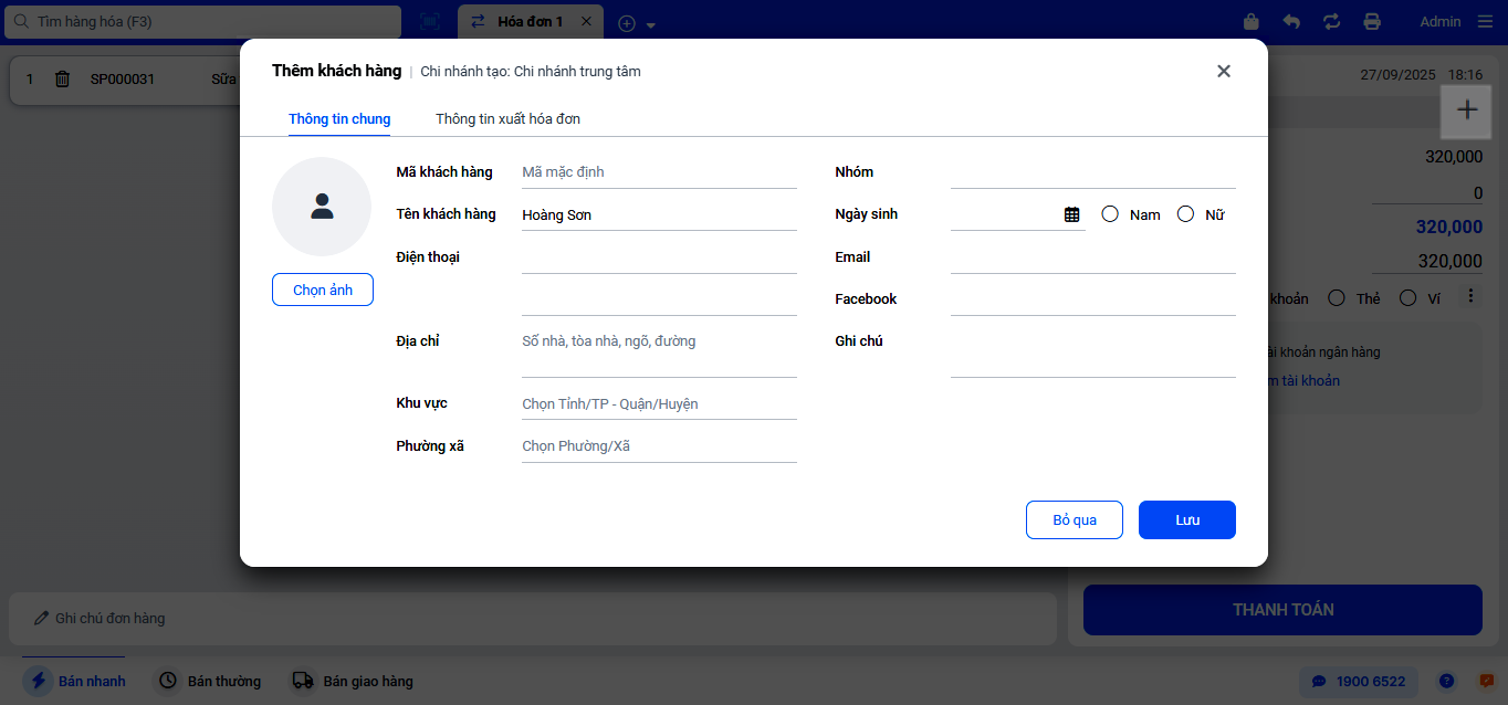 - Điền tên khách hàng và nhấn Lưu.