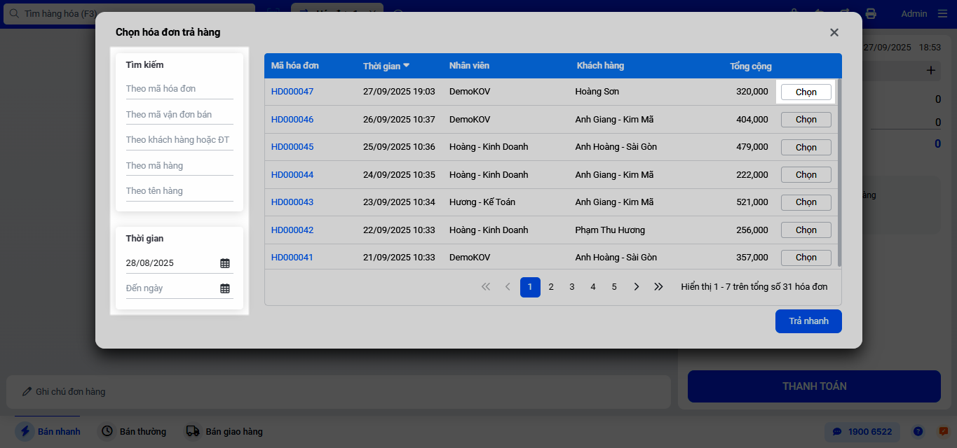 (2) Tìm và chọn hóa đơn gốc: Sử dụng ô tìm kiếm để tra cứu theo mã hóa đơn, tên khách hàng hoặc tên sản phẩm. Chọn hóa đơn gốc tương ứng.