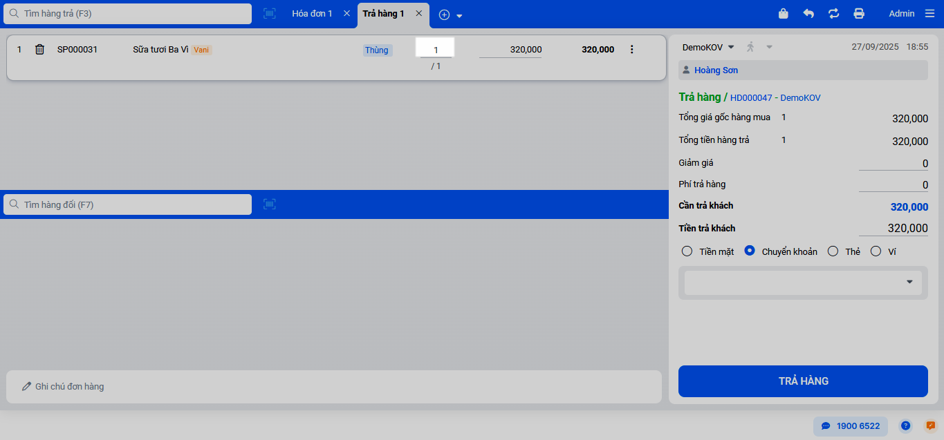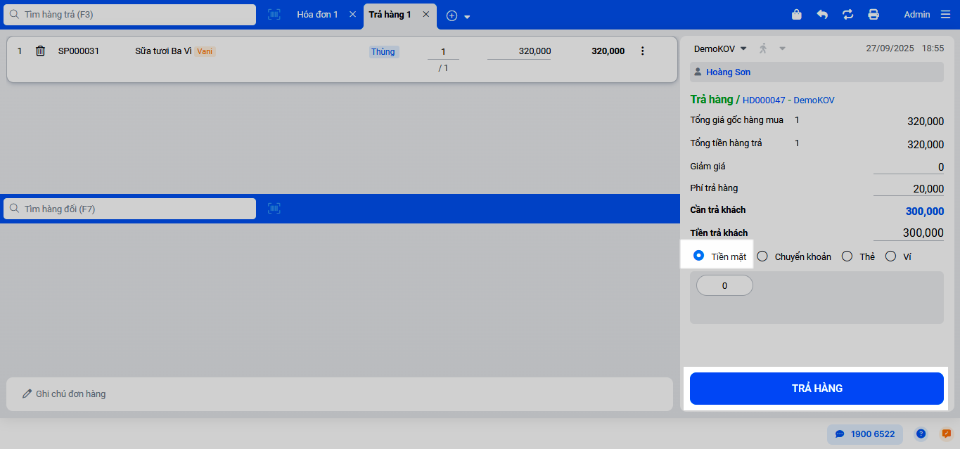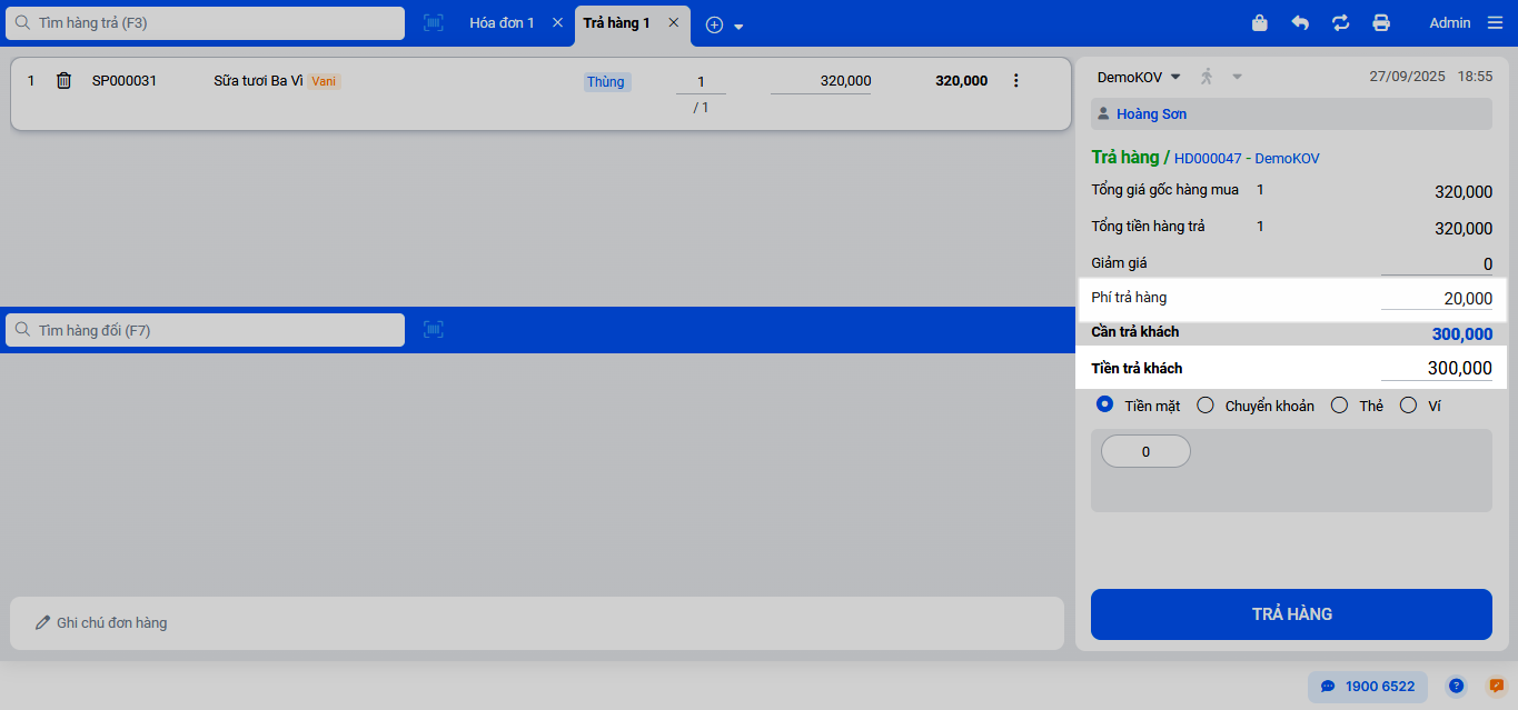- Tình huống: Khi bạn cần xử lý trường hợp khách hàng trả lại một sản phẩm đã mua (ví dụ: 1 thùng “Sữa tươi Ba Vì – Vani”) và cửa hàng của bạn có chính sách thu phí dịch vụ (ví dụ: 20.000đ) cho mỗi lần trả hàng.