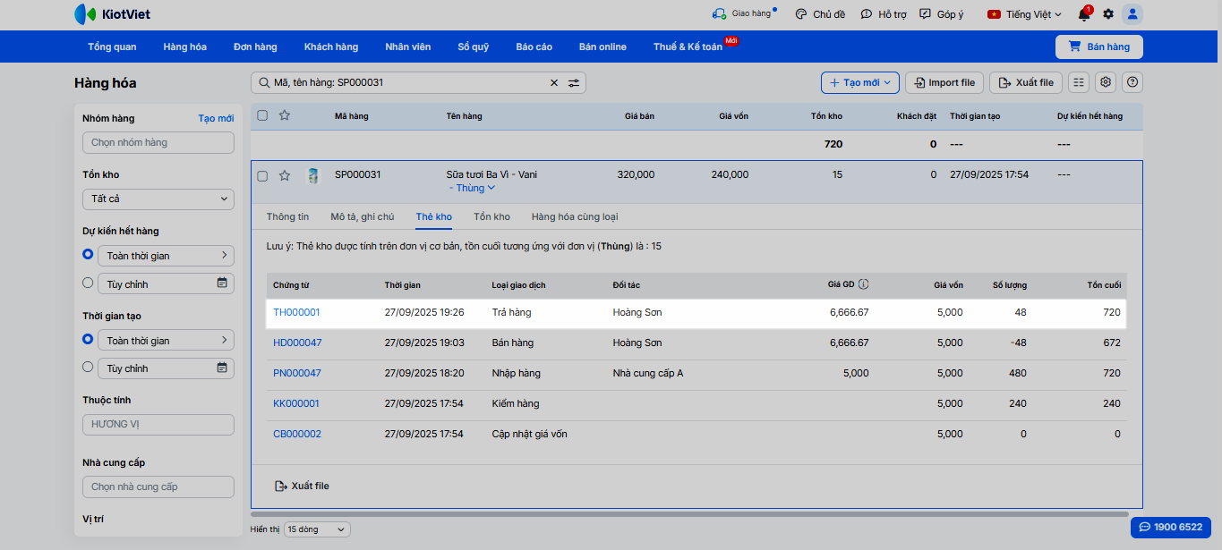 - Sau khi hoàn tất, tồn kho của sản phẩm sẽ được tự động cộng lại. Giao dịch trả hàng và khoản phí cũng được ghi nhận vào hệ thống báo cáo.