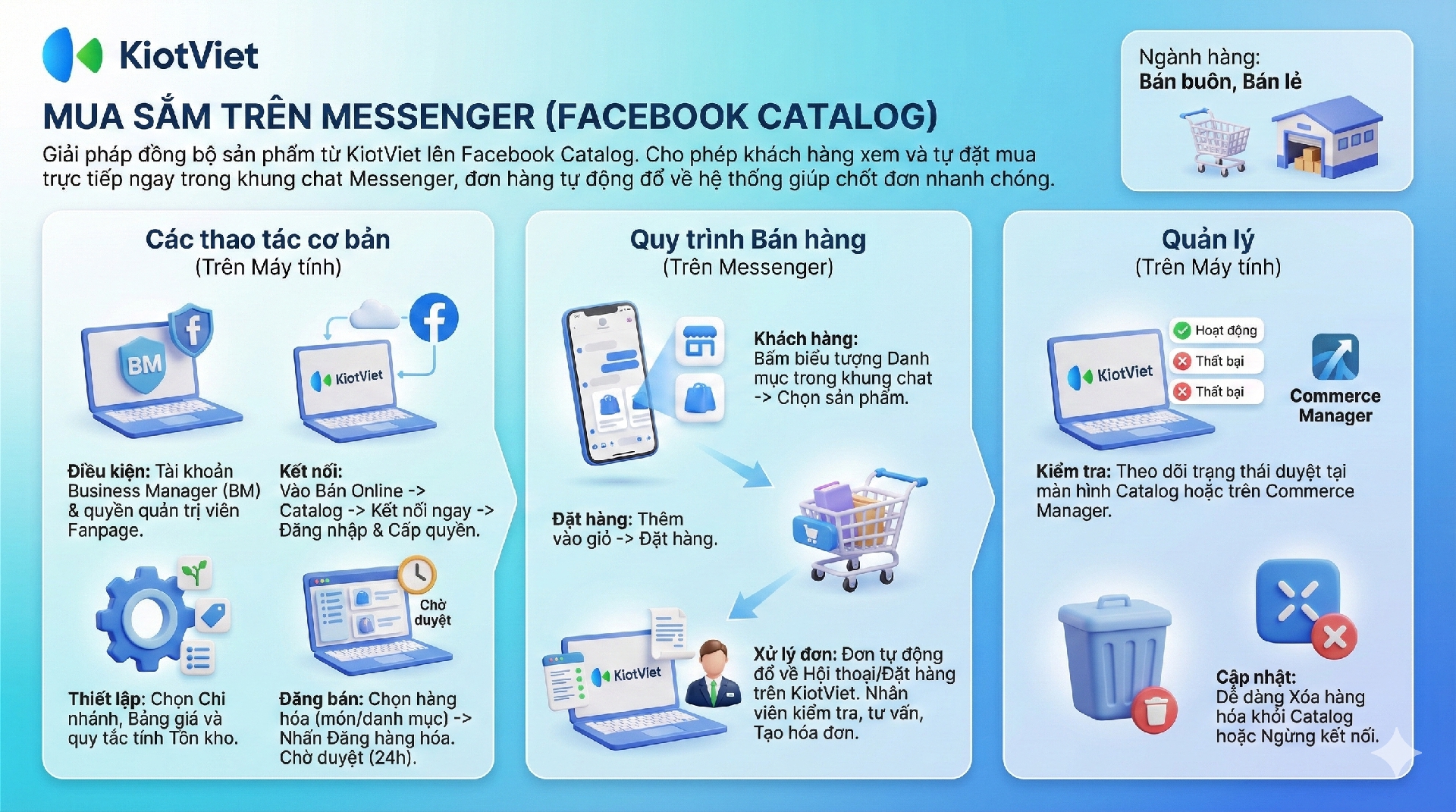 - Quản lý sản phẩm hiệu quả: Đồng bộ và tự động cập nhật thông tin sản phẩm, giá bán, và tồn kho từ phần mềm bán hàng lên Facebook Catalog.