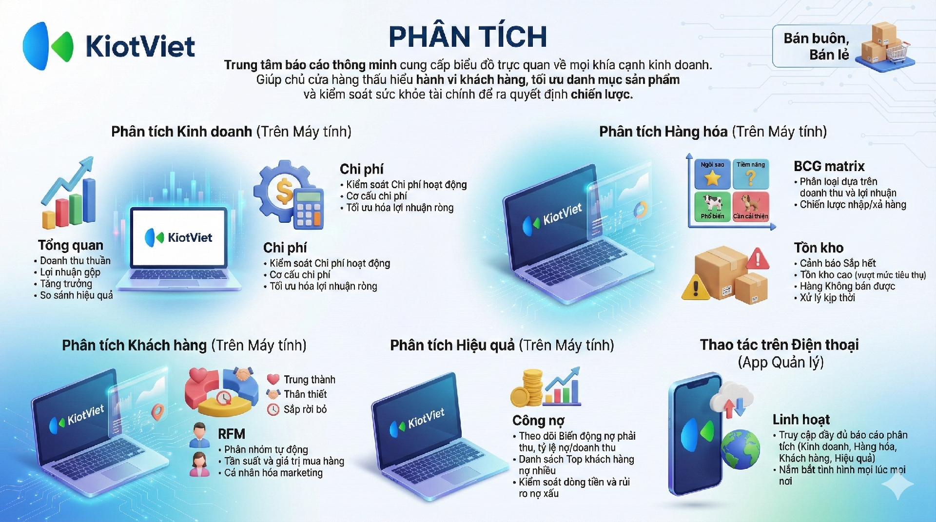 Tính năng Phân tích là một trung tâm báo cáo nâng cao, cung cấp các biểu đồ và số liệu trực quan về mọi khía cạnh của hoạt động kinh doanh. Tính năng này giúp chủ cửa hàng dễ dàng theo dõi hiệu suất bán hàng (Kinh doanh), tình trạng hàng hóa (Hàng hóa), hành vi và chân dung khách hàng (Khách hàng), cũng như sức khỏe tài chính và công nợ (Hiệu quả) để nhanh chóng phát hiện các điểm bất thường và đưa ra các quyết định chiến lược kịp thời.
