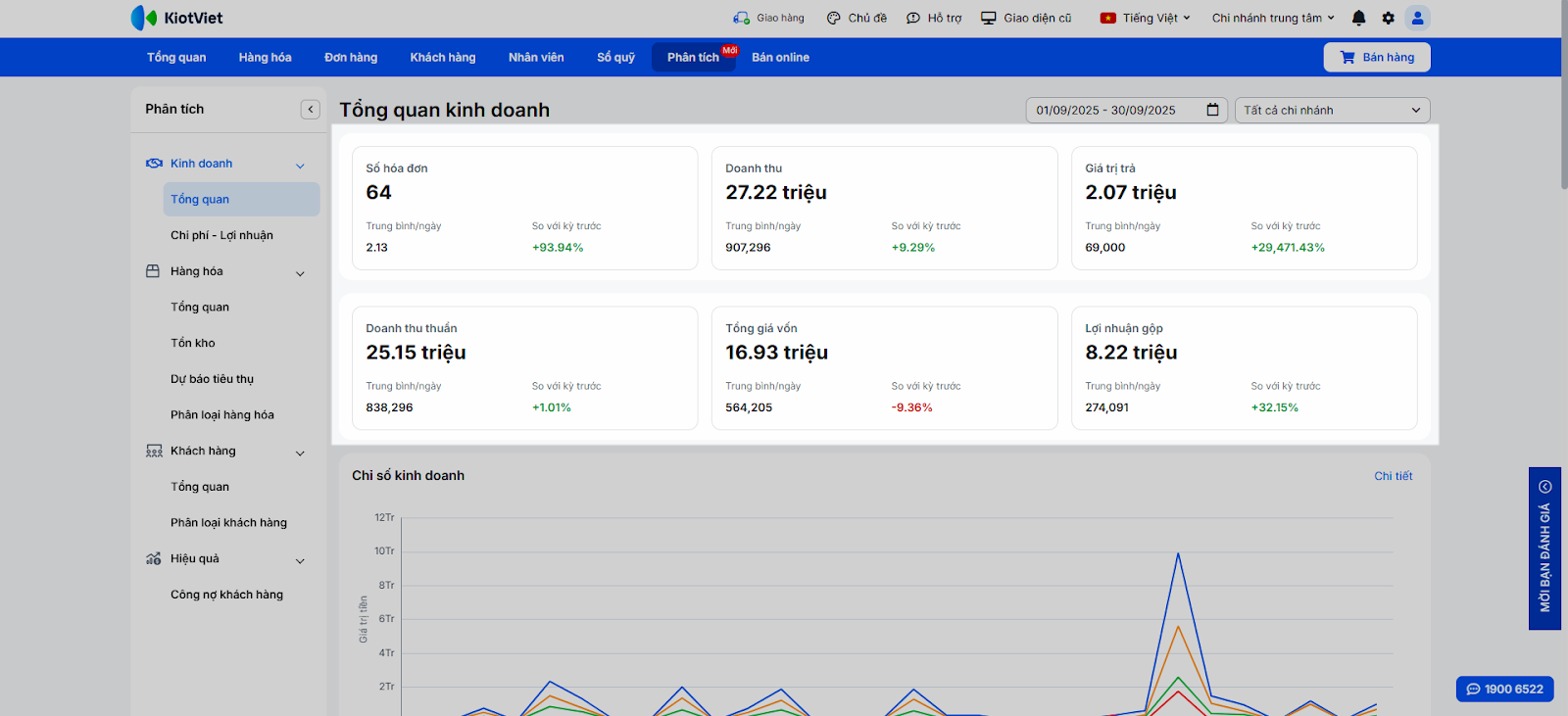 - Thể hiện các chỉ số kinh doanh chính (Hóa đơn, Doanh thu, Trả hàng, Doanh thu thuần, Tổng giá vốn, Lợi nhuận gộp).
