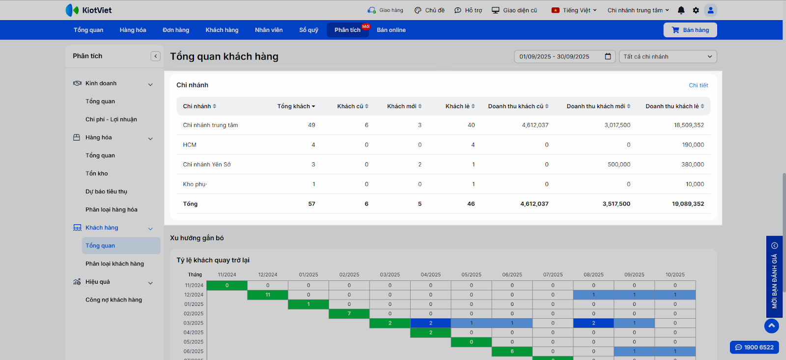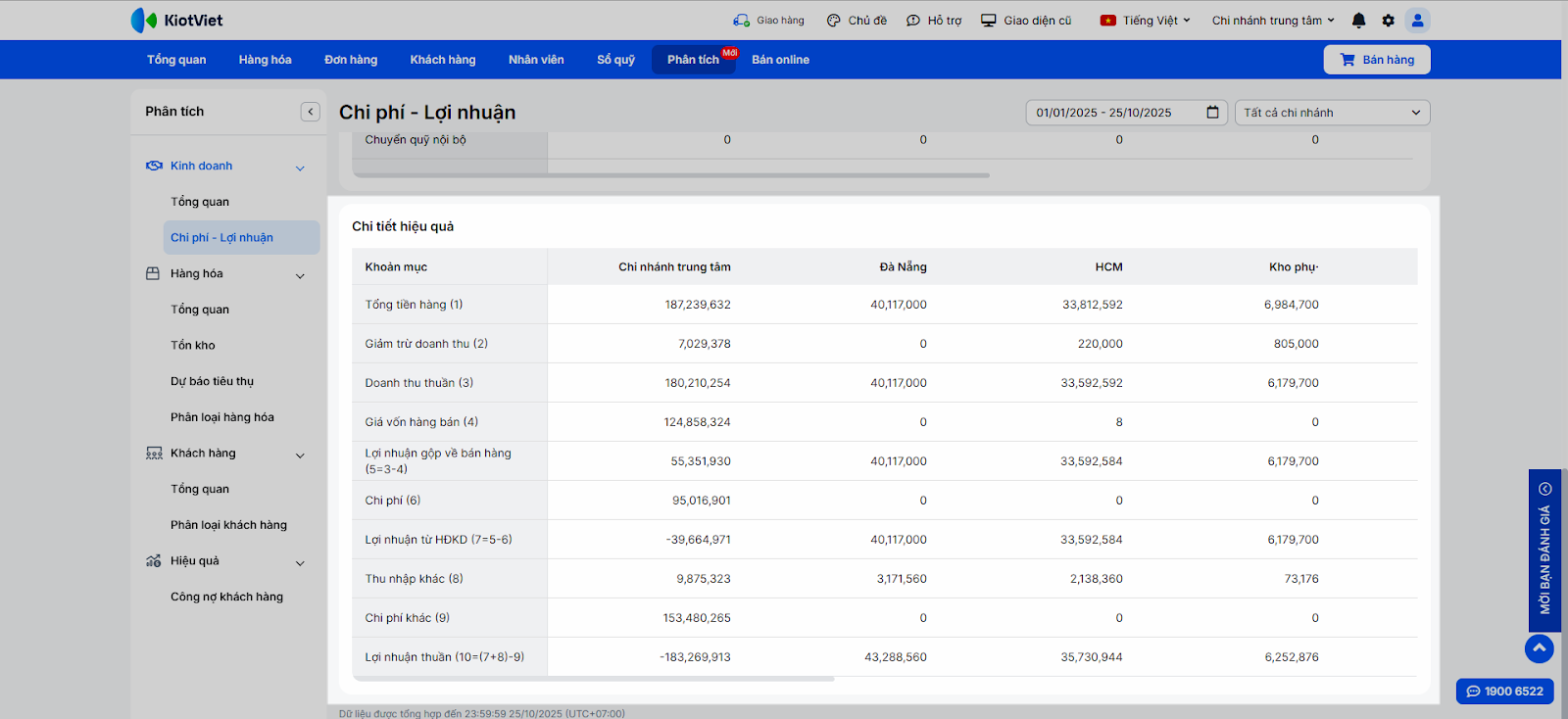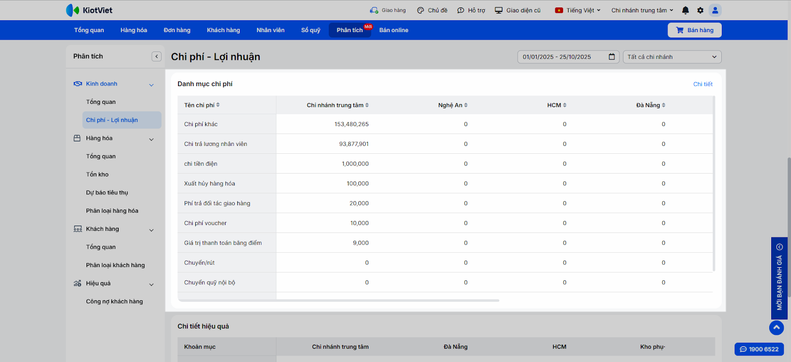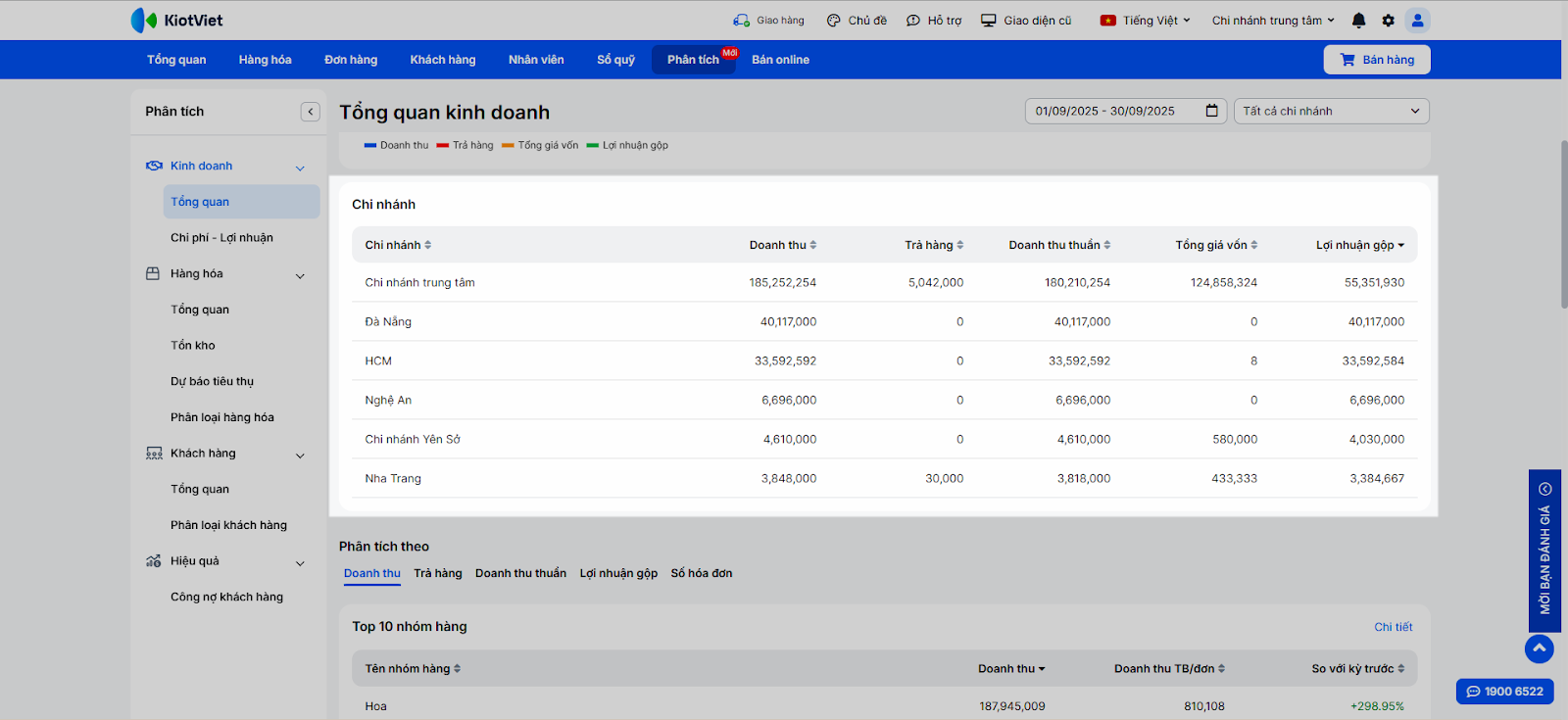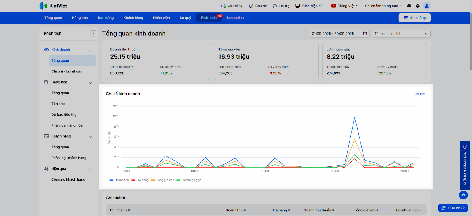 - Thể hiện các chỉ số kinh doanh chi tiết ở từng chi nhánh (áp dụng khi có từ 2 chi nhánh trở lên).