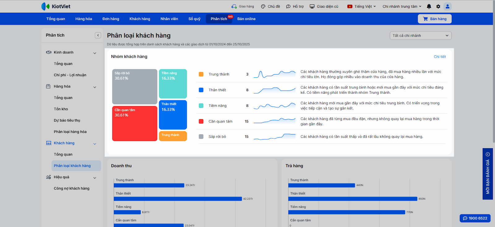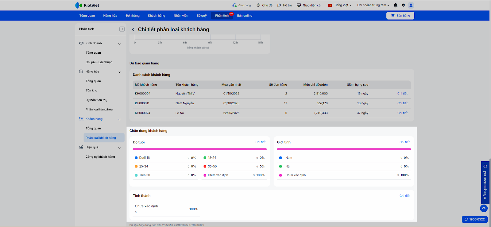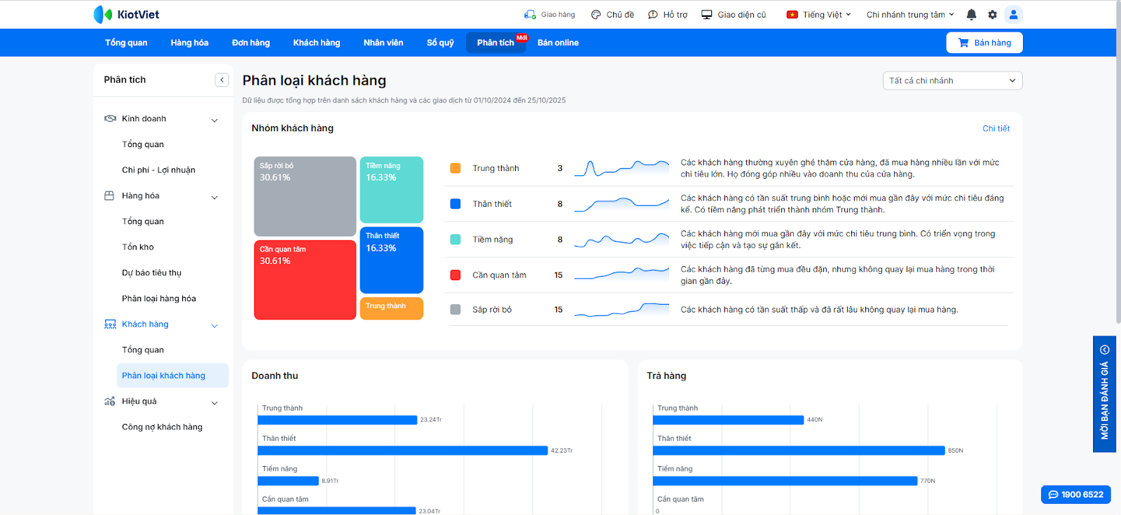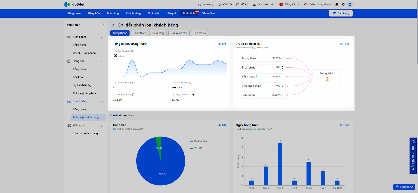 Phân loại khách hàng theo mô hình RFM (Recency – Gần nhất, Frequency – Tần suất, Monetary – Giá trị tiền tệ) để cá nhân hóa chiến dịch marketing và tối ưu nguồn lực. Để xem báo cáo, trên menu Phân tích → Khách hàng, bạn kích chọn Phân loại khách hàng.