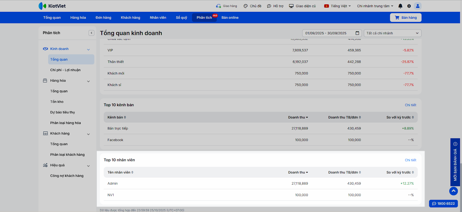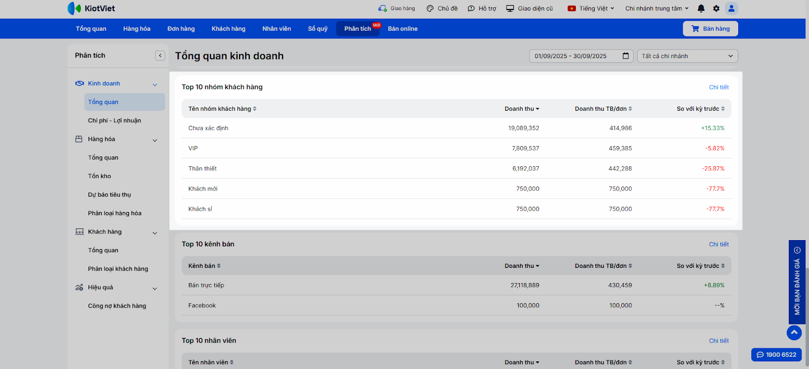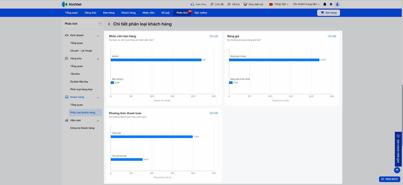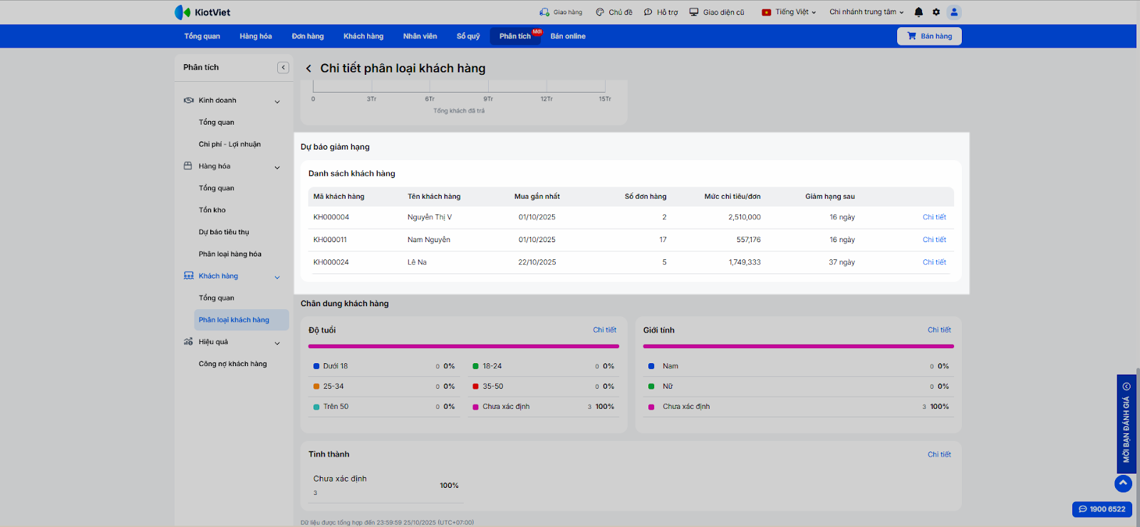 Phân loại khách hàng theo mô hình RFM (Recency – Gần nhất, Frequency – Tần suất, Monetary – Giá trị tiền tệ) để cá nhân hóa chiến dịch marketing và tối ưu nguồn lực. Để xem báo cáo, trên menu Phân tích → Khách hàng, bạn kích chọn Phân loại khách hàng.