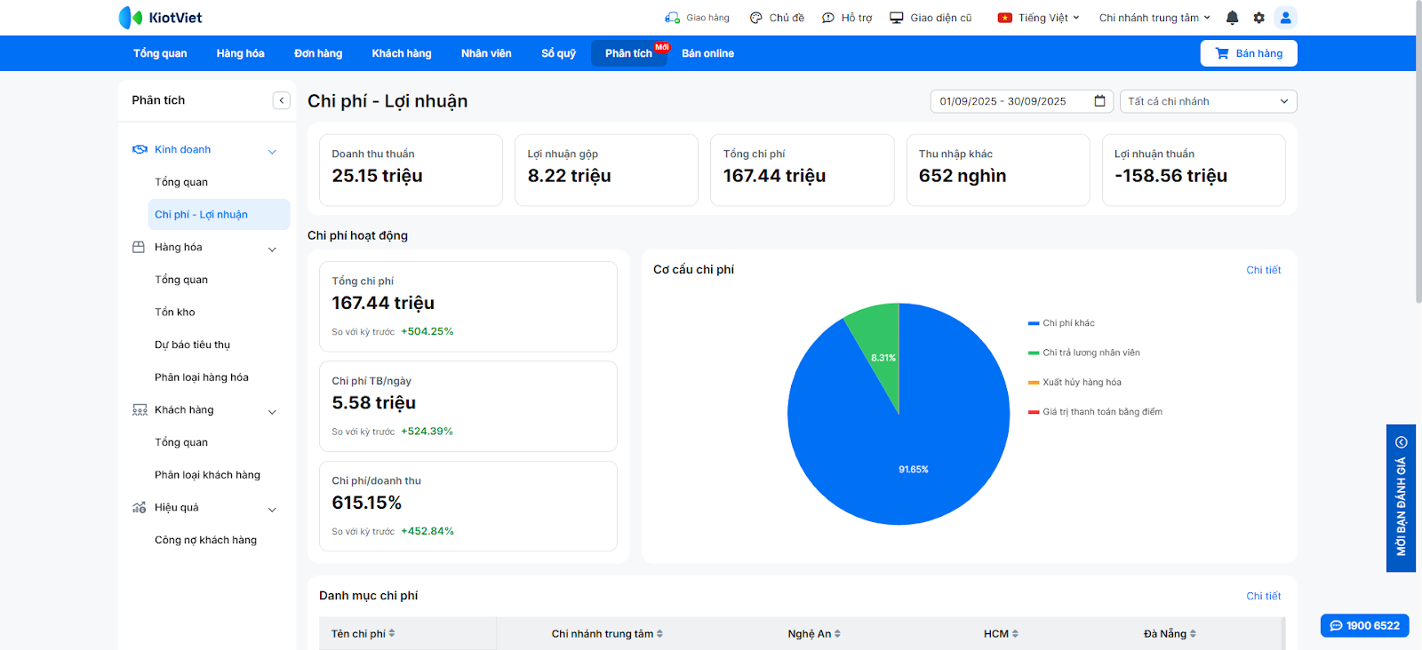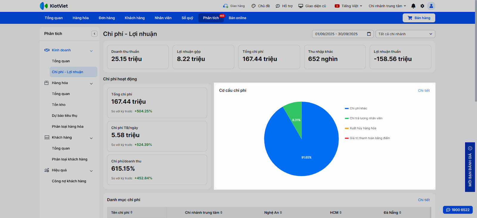 Để xem báo cáo, trên menu Phân tích → Kinh doanh, bạn kích chọn Chi phí – Lợi nhuận.