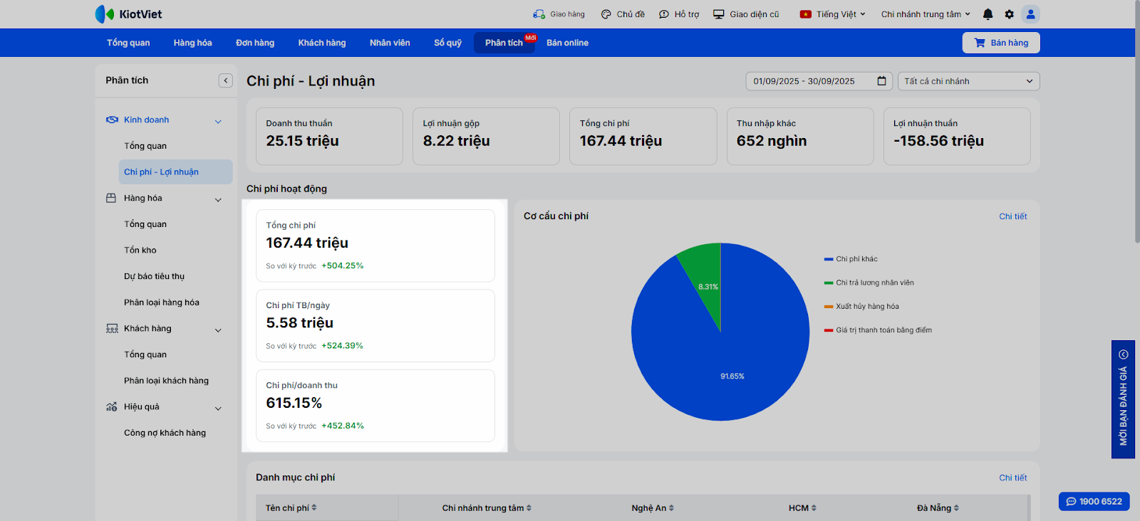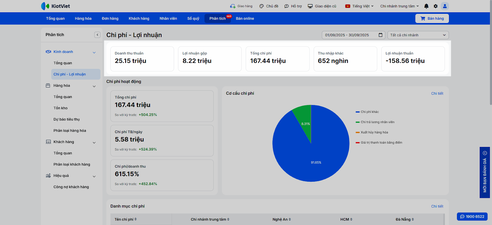 - Thể hiện danh sách chi tiết các loại chi phí và tỷ lệ tăng trưởng so với kỳ trước.