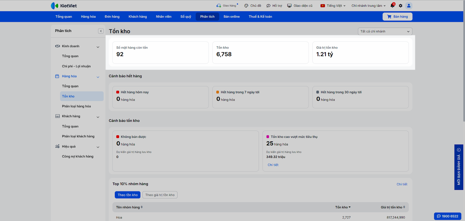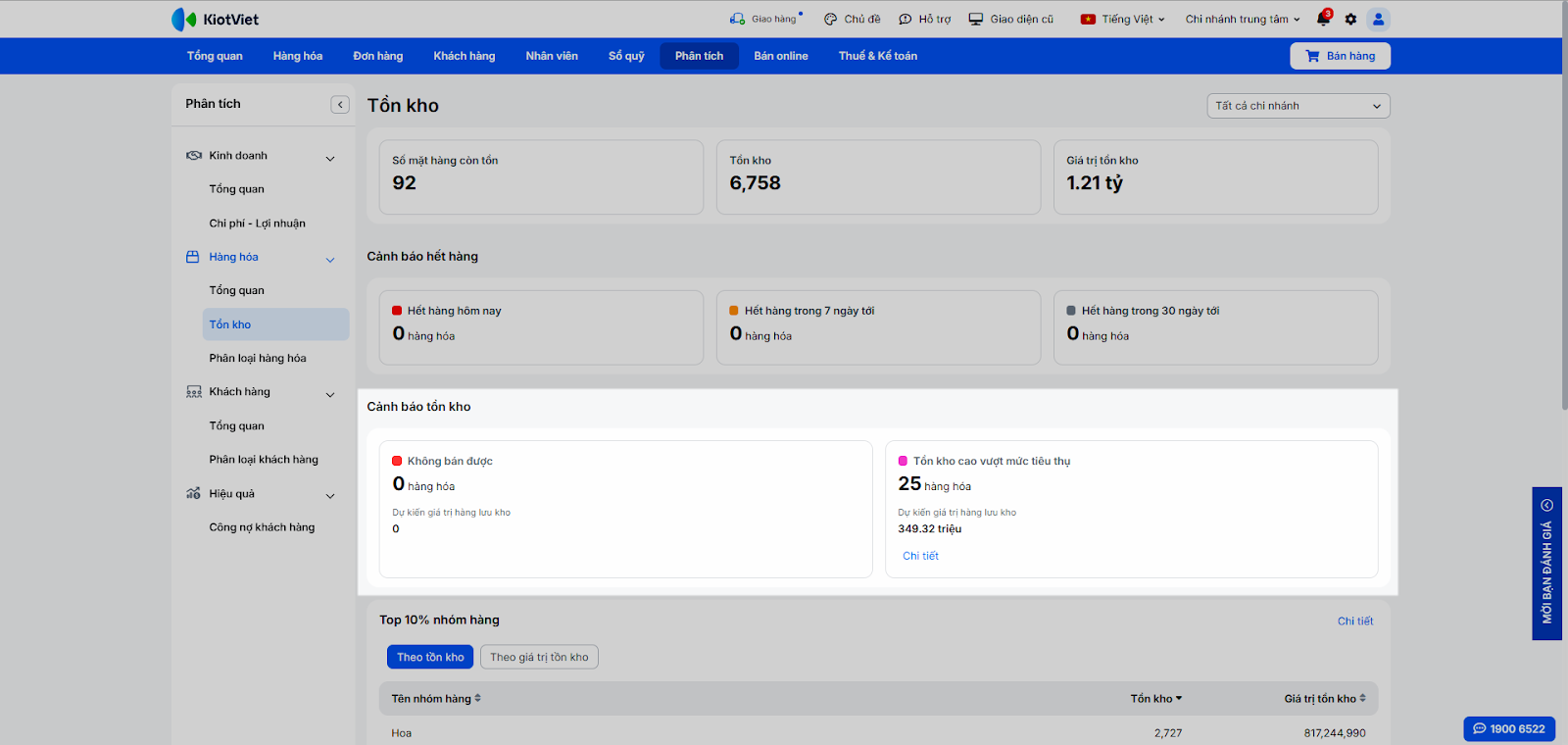 - Top 10% nhóm hàng / Top 10% hàng hóa: Thể hiện top hàng hóa/nhóm hàng theo tiêu chí số lượng tồn kho hoặc giá trị tồn kho cao nhất.