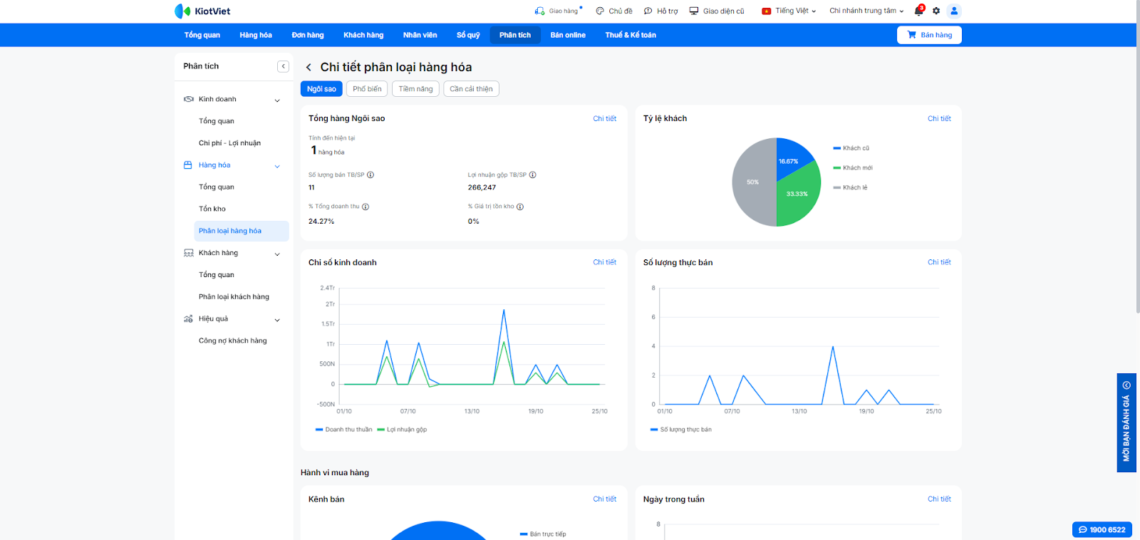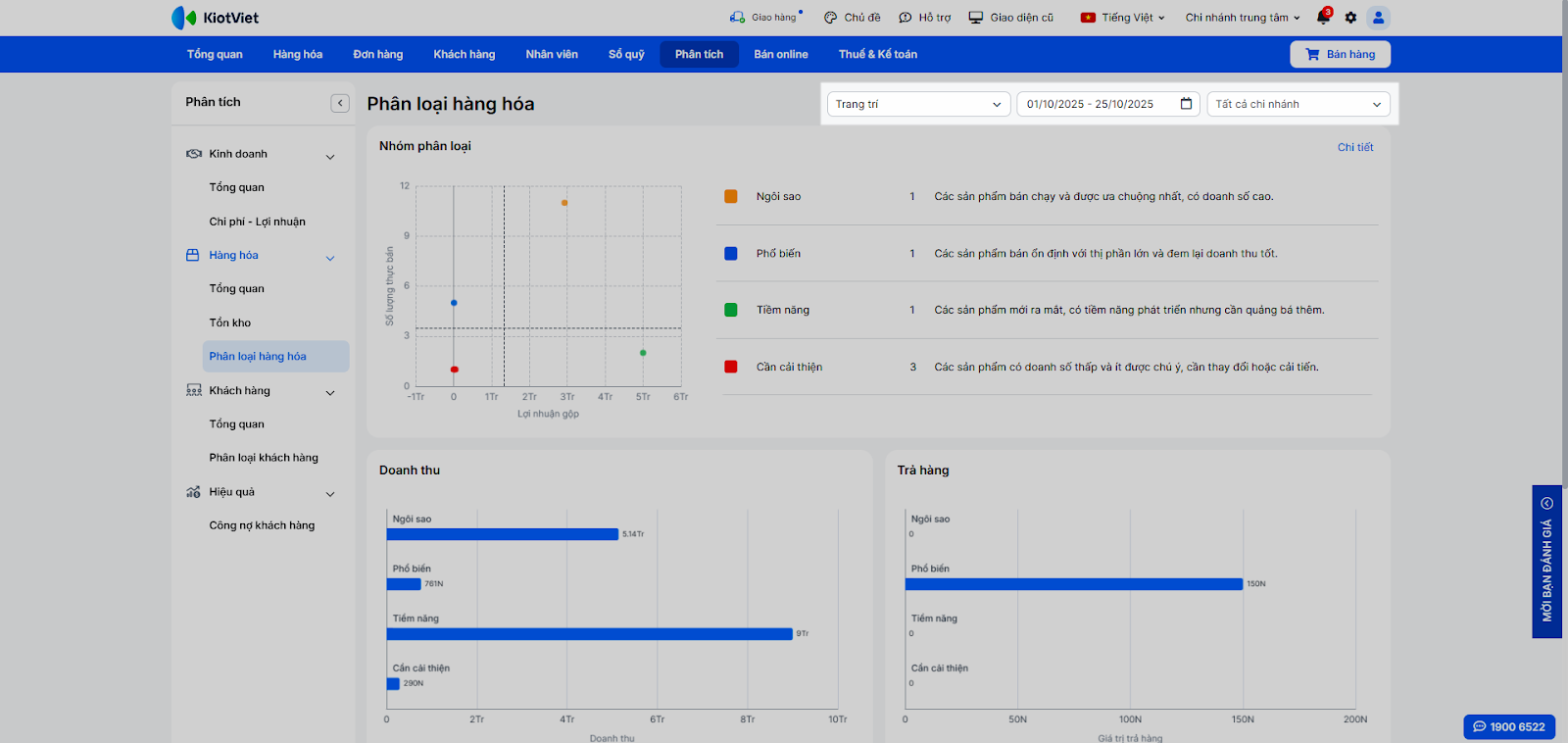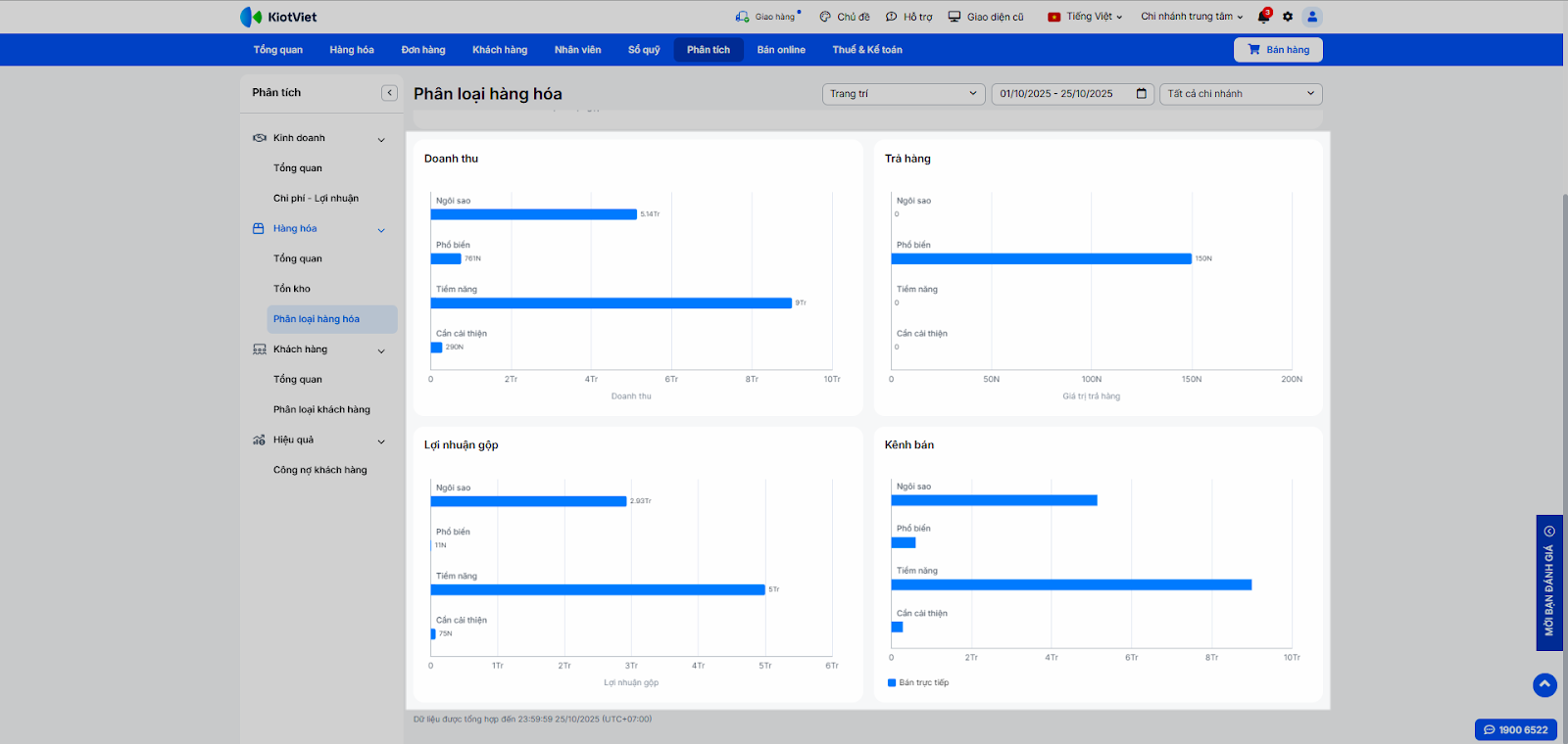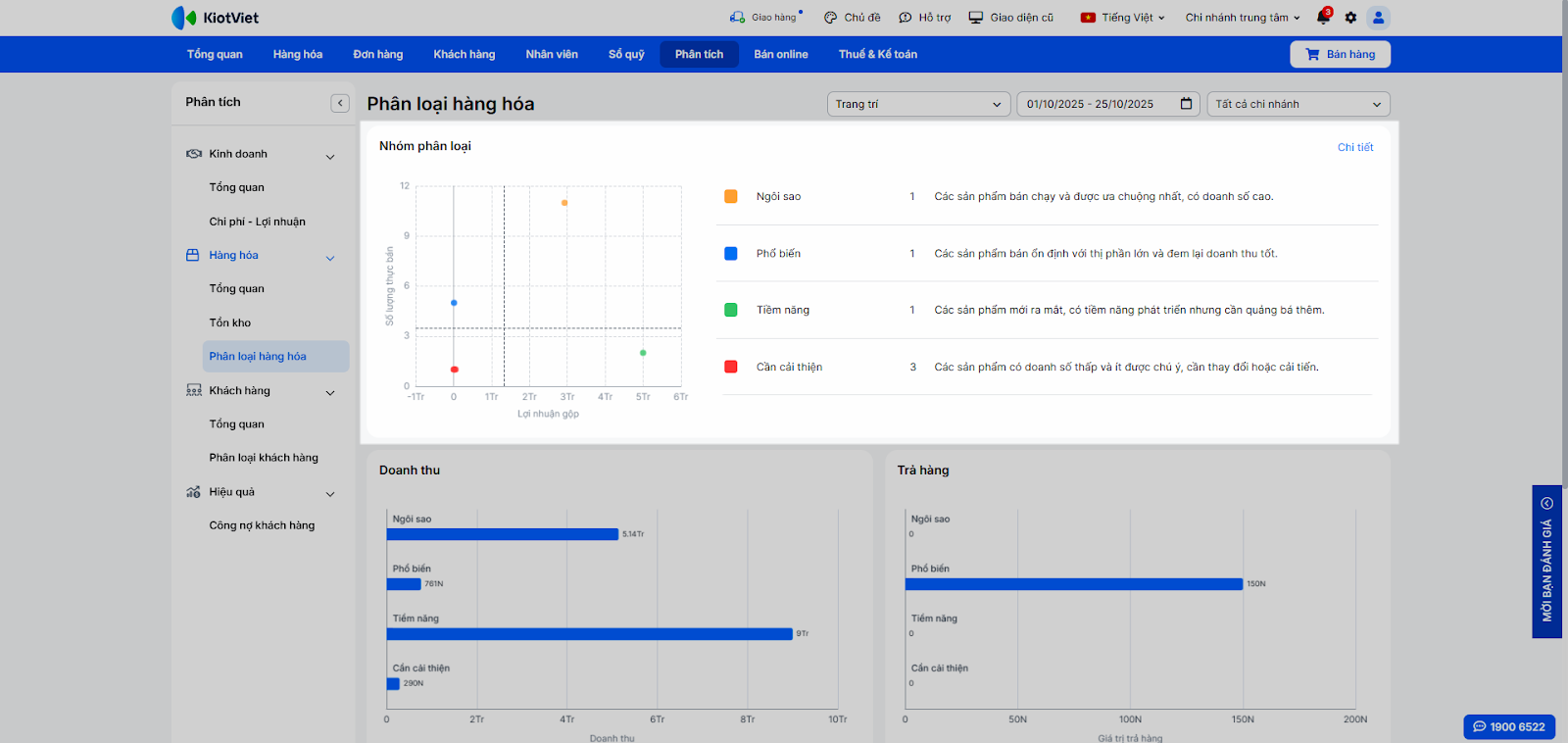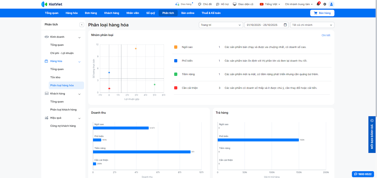 - Tối ưu quản lý hàng hóa: Cung cấp cái nhìn toàn diện về hiệu quả kinh doanh của hàng hóa, giúp phân tích đánh giá, tối ưu hóa danh mục sản phẩm và theo dõi tồn kho.