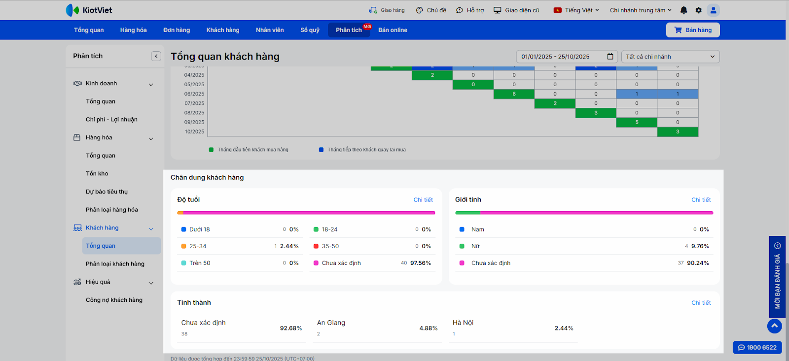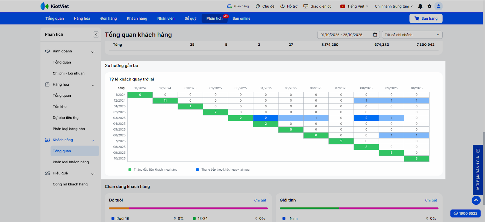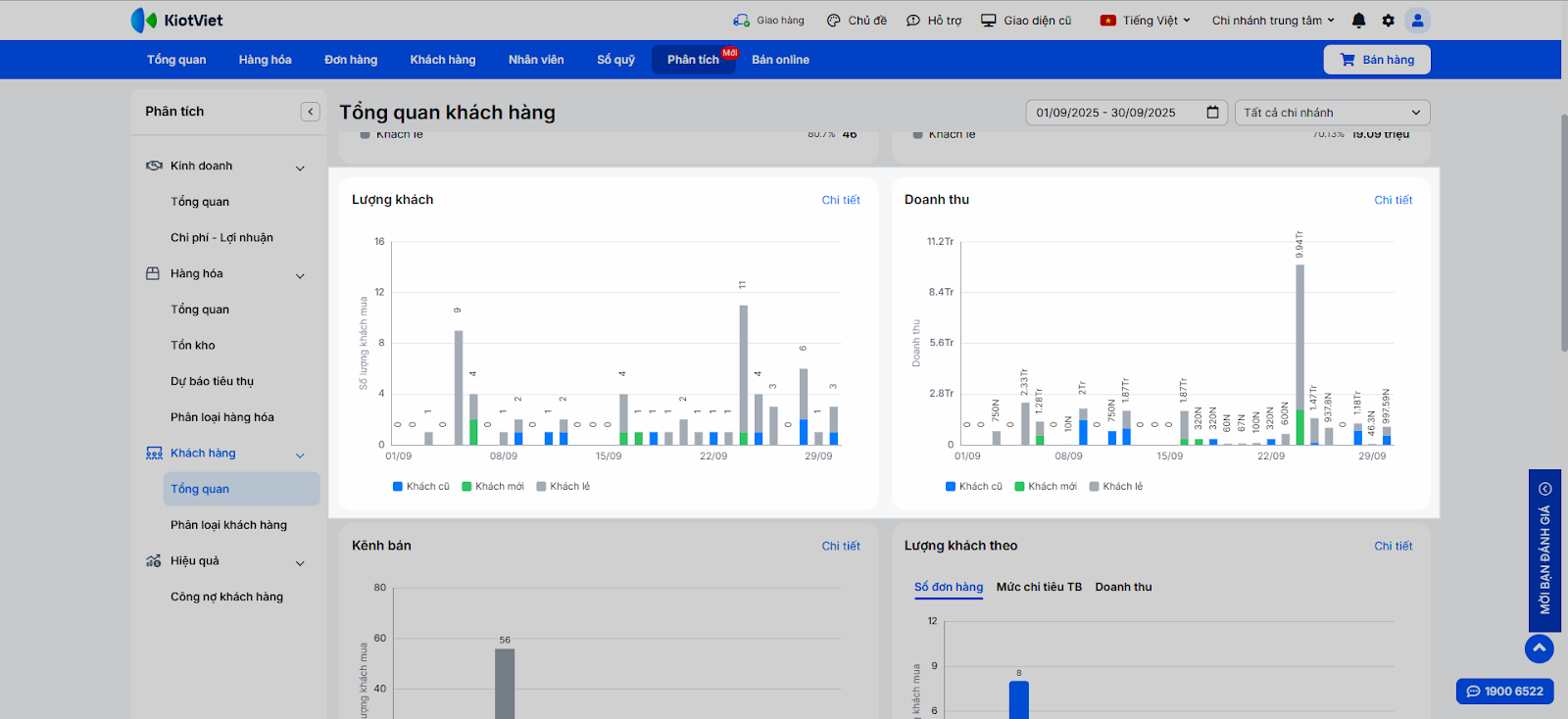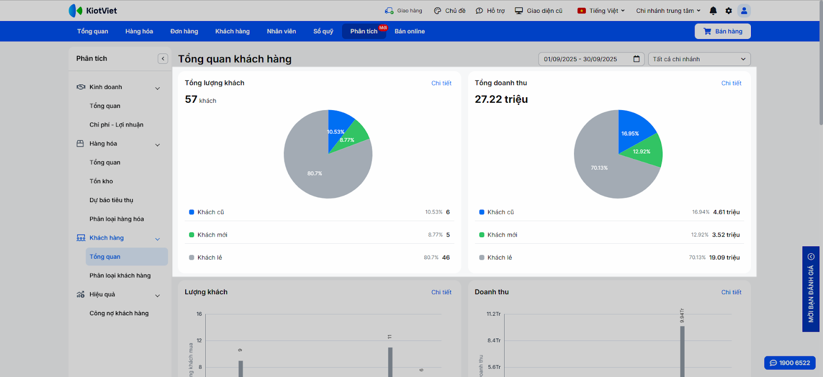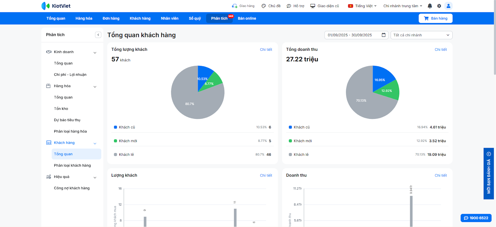 - Biểu đồ Tổng lượng khách / Tổng doanh thu: Thể hiện tỷ lệ phần trăm số lượng và doanh thu của 3 nhóm: Khách mới (mua lần đầu trong kỳ), Khách cũ (mua lại trong kỳ), Khách lẻ.