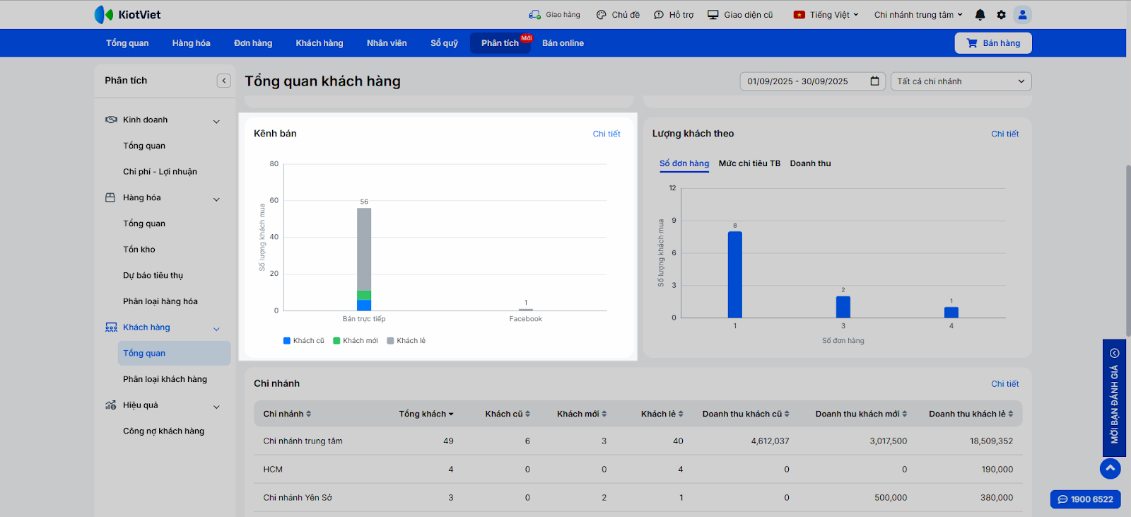 - Biểu đồ Kênh bán: Thể hiện lượng khách hàng từ các kênh bán hàng (cửa hàng, website, Facebook,…) theo từng loại khách.