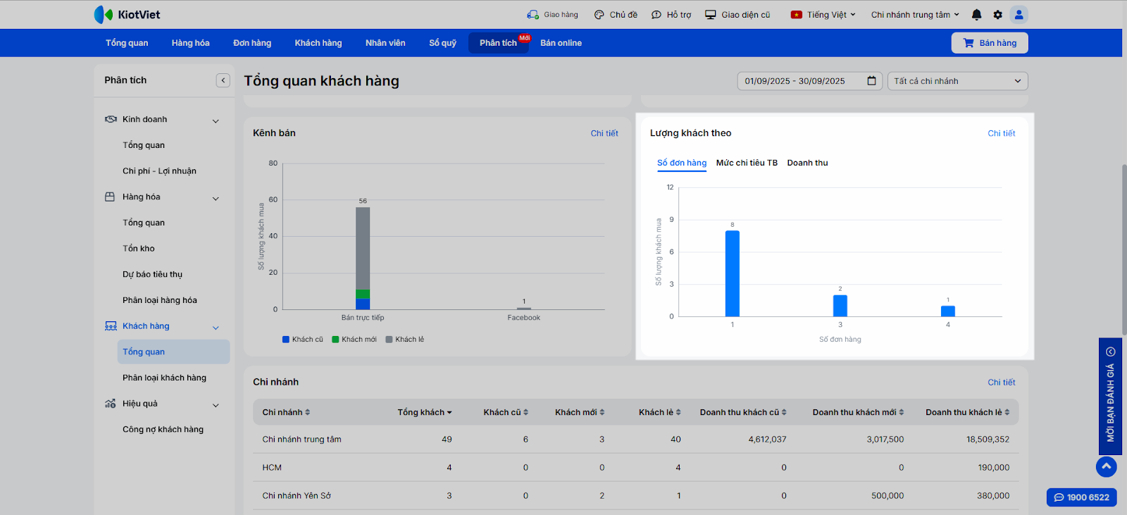 Để xem báo cáo, trên menu Phân tích → Khách hàng, bạn kích chọn Tổng quan.