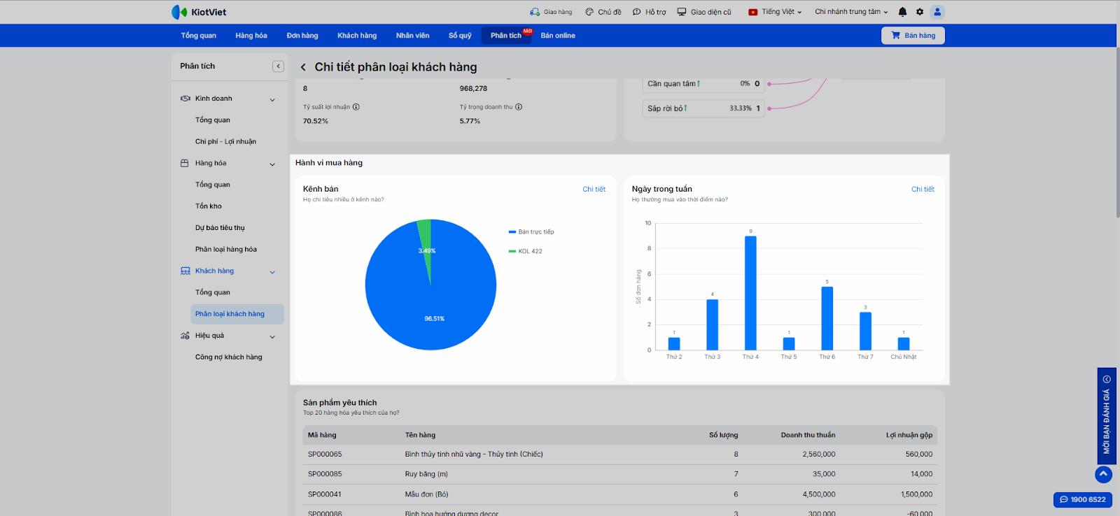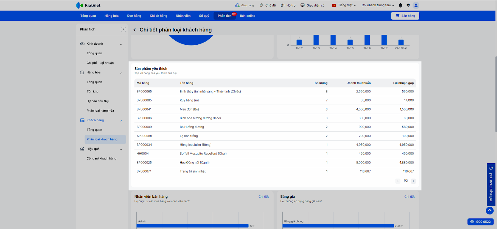 - Sản phẩm yêu thích: Top 20 hàng hóa yêu thích của khách hàng.