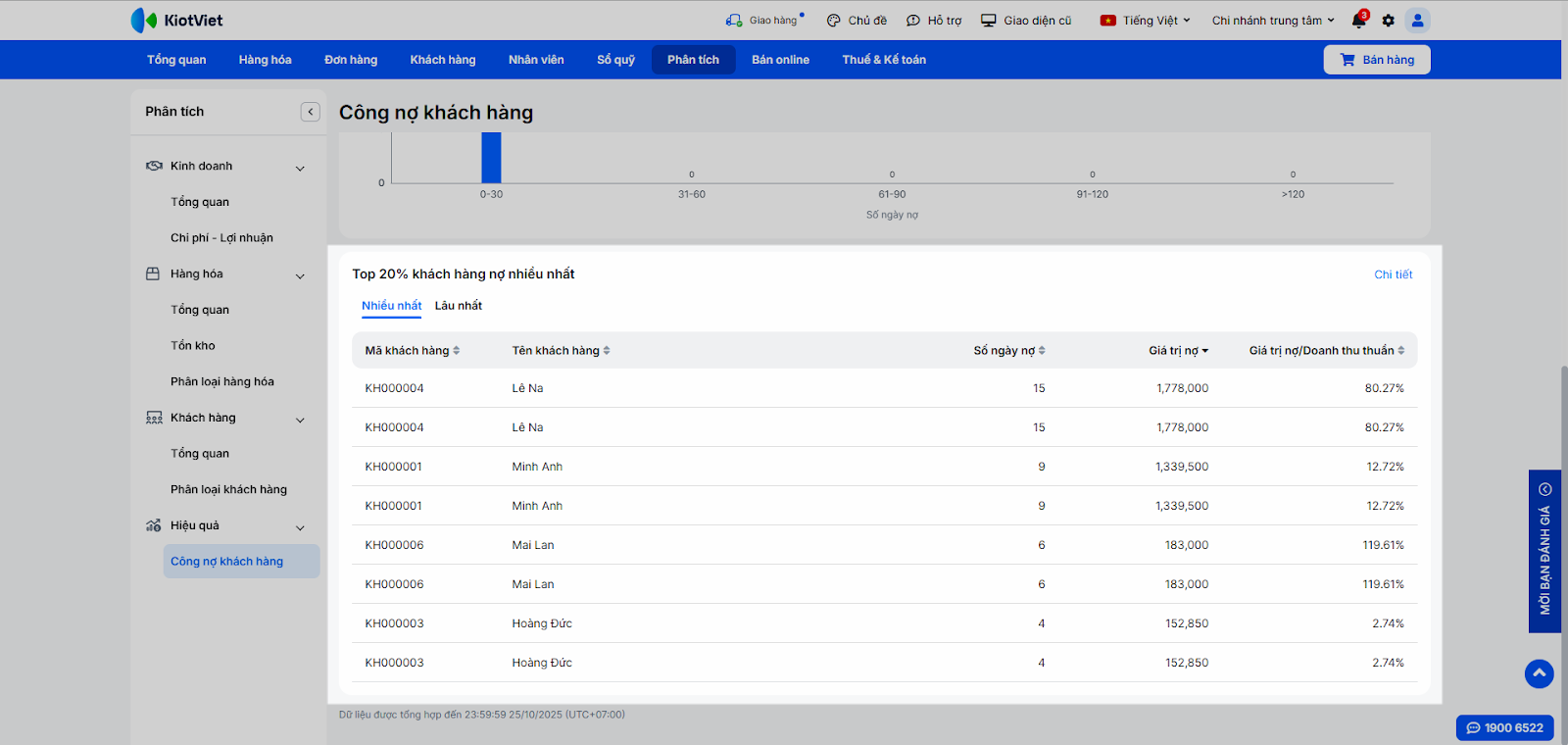 Để xem báo cáo, trên menu Phân tích → Hiệu quả, bạn kích chọn Công nợ khách hàng.