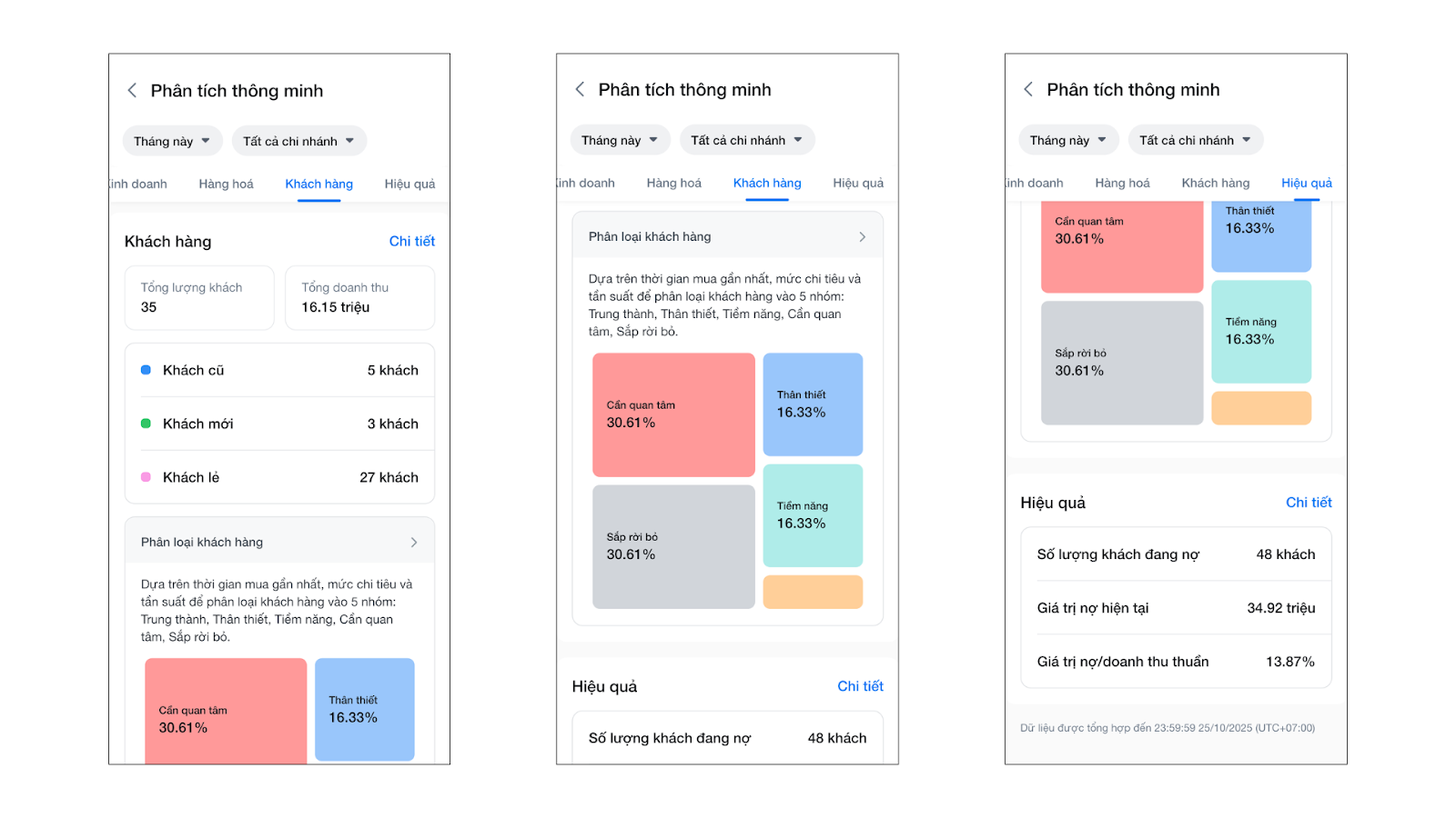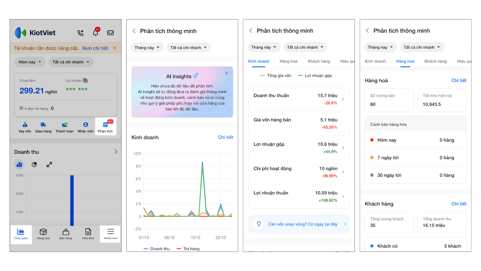 Tính năng Phân tích là một trung tâm báo cáo nâng cao, cung cấp các biểu đồ và số liệu trực quan về mọi khía cạnh của hoạt động kinh doanh. Tính năng này giúp chủ cửa hàng dễ dàng theo dõi hiệu suất bán hàng (Kinh doanh), tình trạng hàng hóa (Hàng hóa), hành vi và chân dung khách hàng (Khách hàng), cũng như sức khỏe tài chính và công nợ (Hiệu quả) để nhanh chóng phát hiện các điểm bất thường và đưa ra các quyết định chiến lược kịp thời.