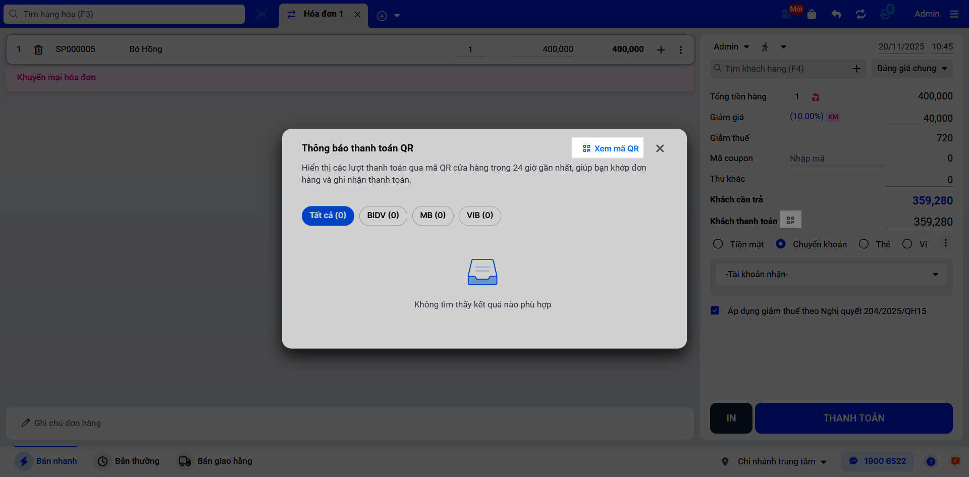 Tình huống: Khi bạn nhận được nhiều khoản thanh toán qua mã QR tĩnh đặt tại quầy (QR Cửa hàng) và cần đối chiếu/khớp chính xác từng giao dịch tiền về với đơn hàng tạm đang lưu, đặc biệt trong khung giờ cao điểm để tránh sai sót.