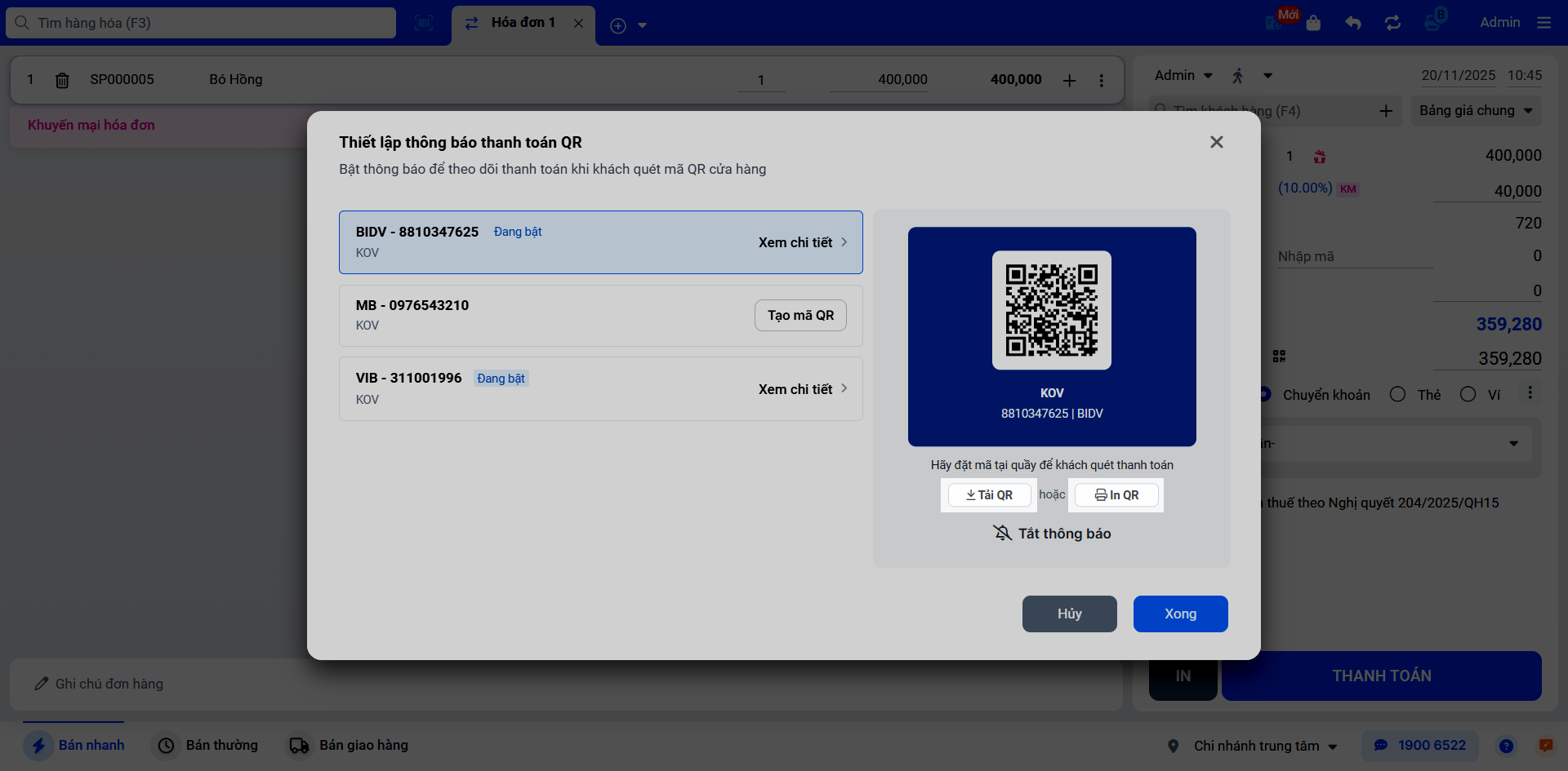 (3) Tại đây, hệ thống mặc định bật Thông báo tiền về khi khách quét QR cửa hàng. Bạn có thể Tải QR hoặc In QR để đặt tại quầy.