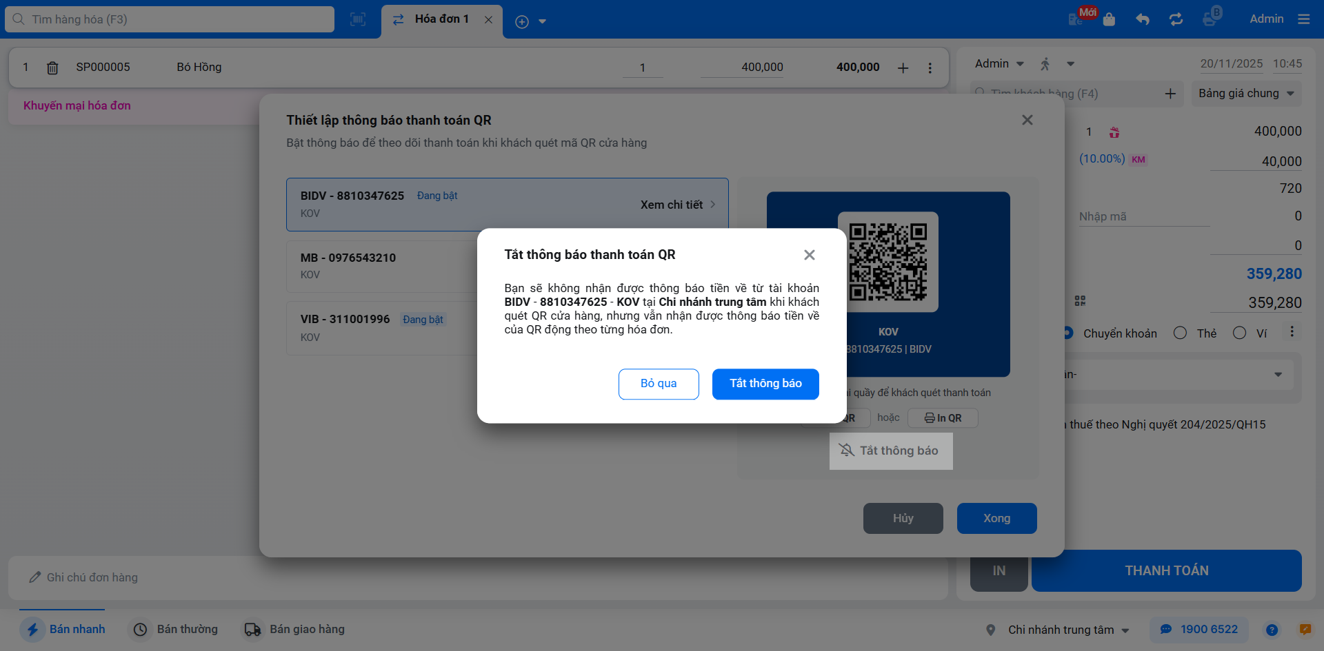 - Nếu không muốn nhận thông báo tiền về từ QR tĩnh cửa hàng, bạn chọn Tắt thông báo.