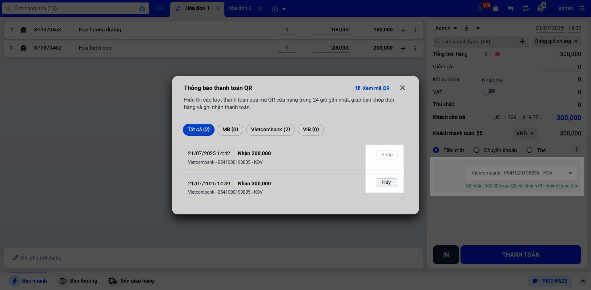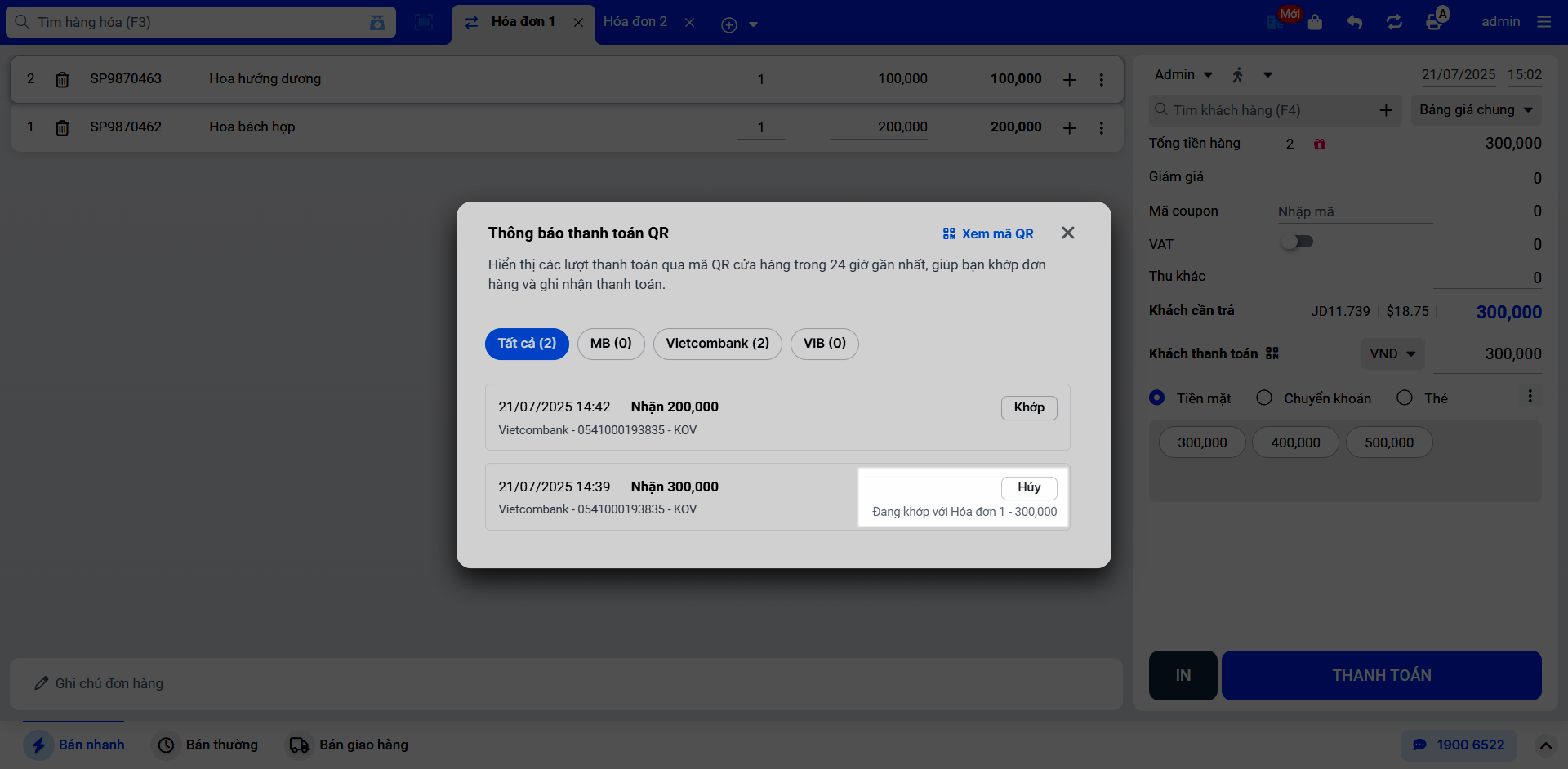 - Tại giao dịch QR đang khớp với đơn tạm khác → hệ thống hiển thị nút Hủy kèm theo thông tin cụ thể đơn tạm đang khớp.