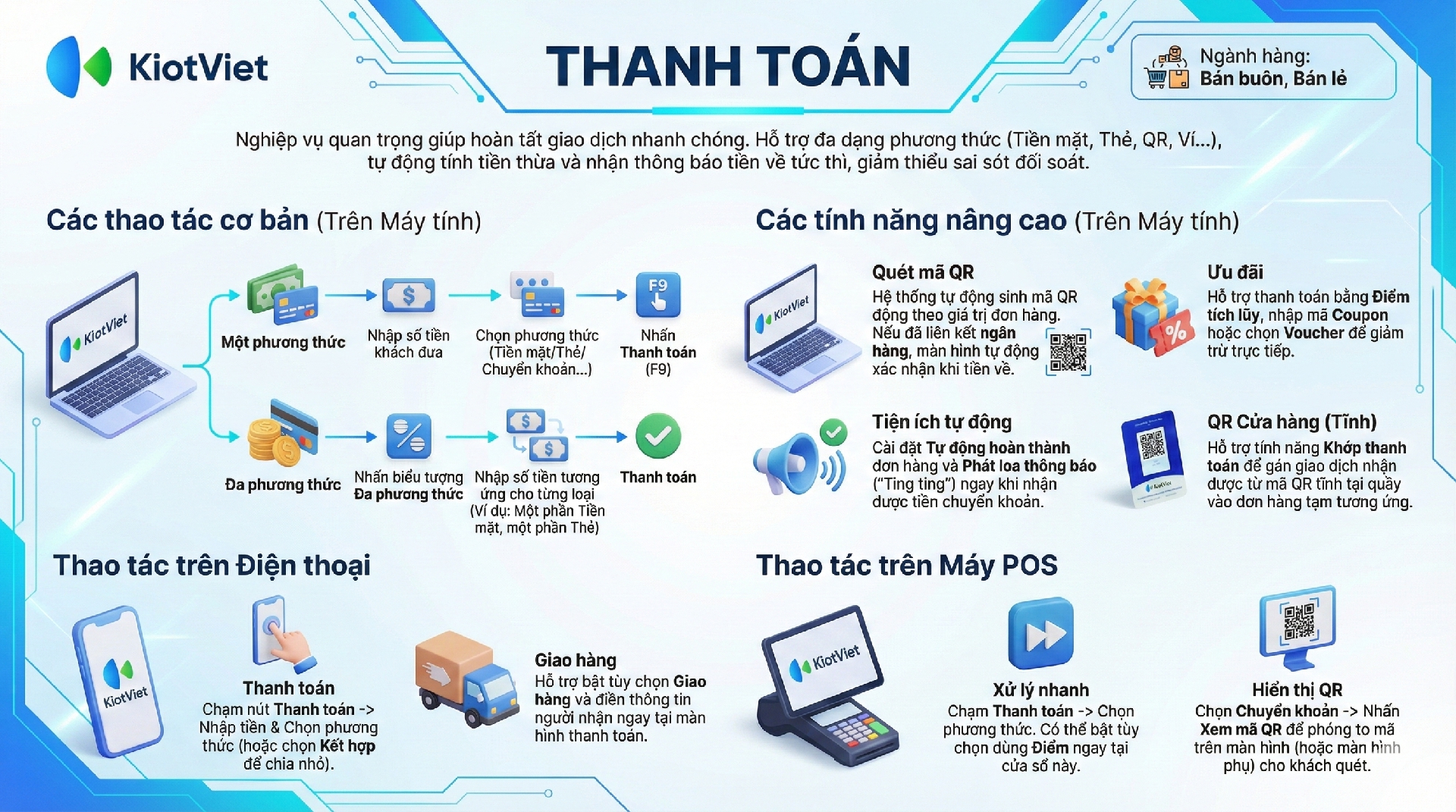 Tính năng Thanh toán là một nghiệp vụ quan trọng giúp hoàn tất giao dịch bán hàng một cách nhanh chóng, chính xác và chuyên nghiệp trên mọi nền tảng của KiotViet.