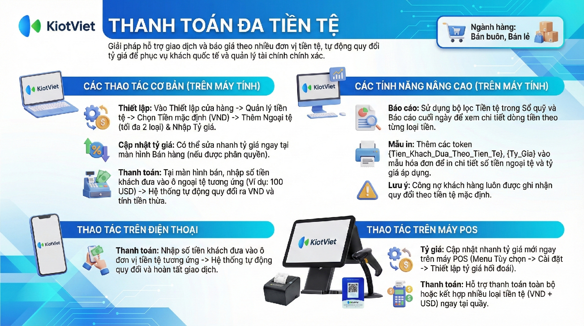 Tính năng Thanh toán Đa tiền tệ trên KiotViet Máy bán hàng hỗ trợ các thao tác thiết lập tỷ giá và thanh toán hóa đơn.