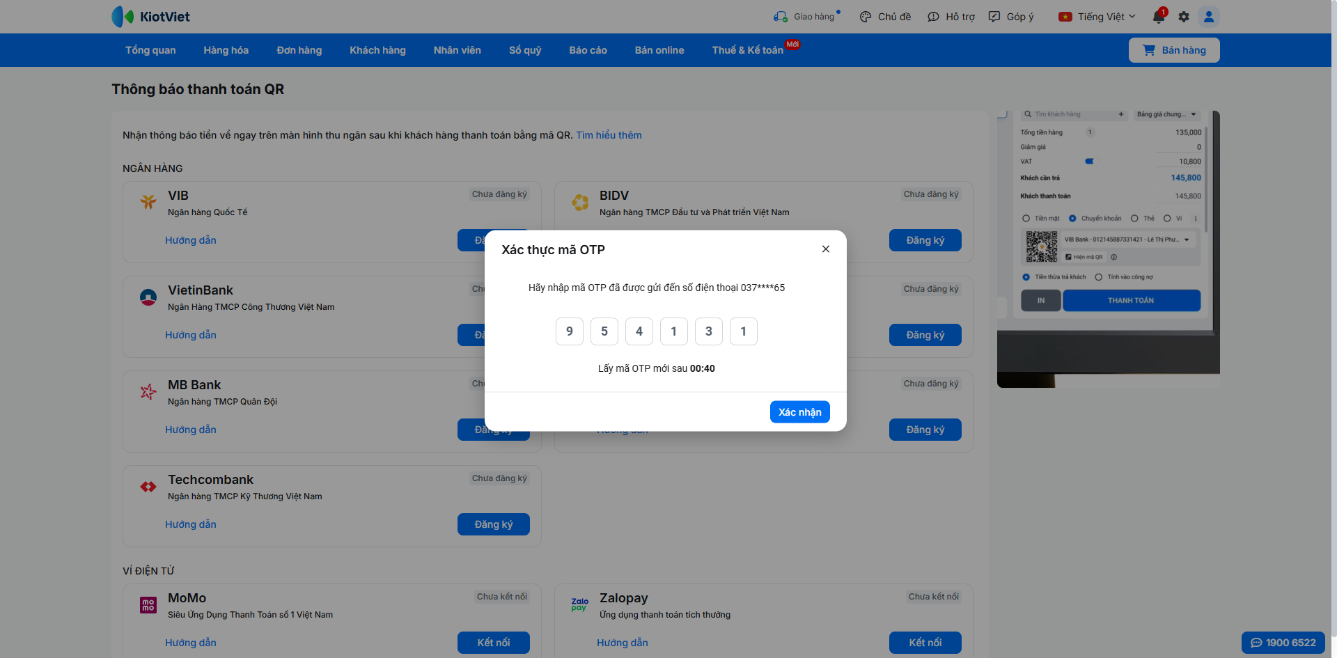 Để kích hoạt tính năng nhận thông báo thanh toán tự động, bạn cần đăng ký dịch vụ trực tiếp trên phần mềm KiotViet và xác thực bằng mã OTP.