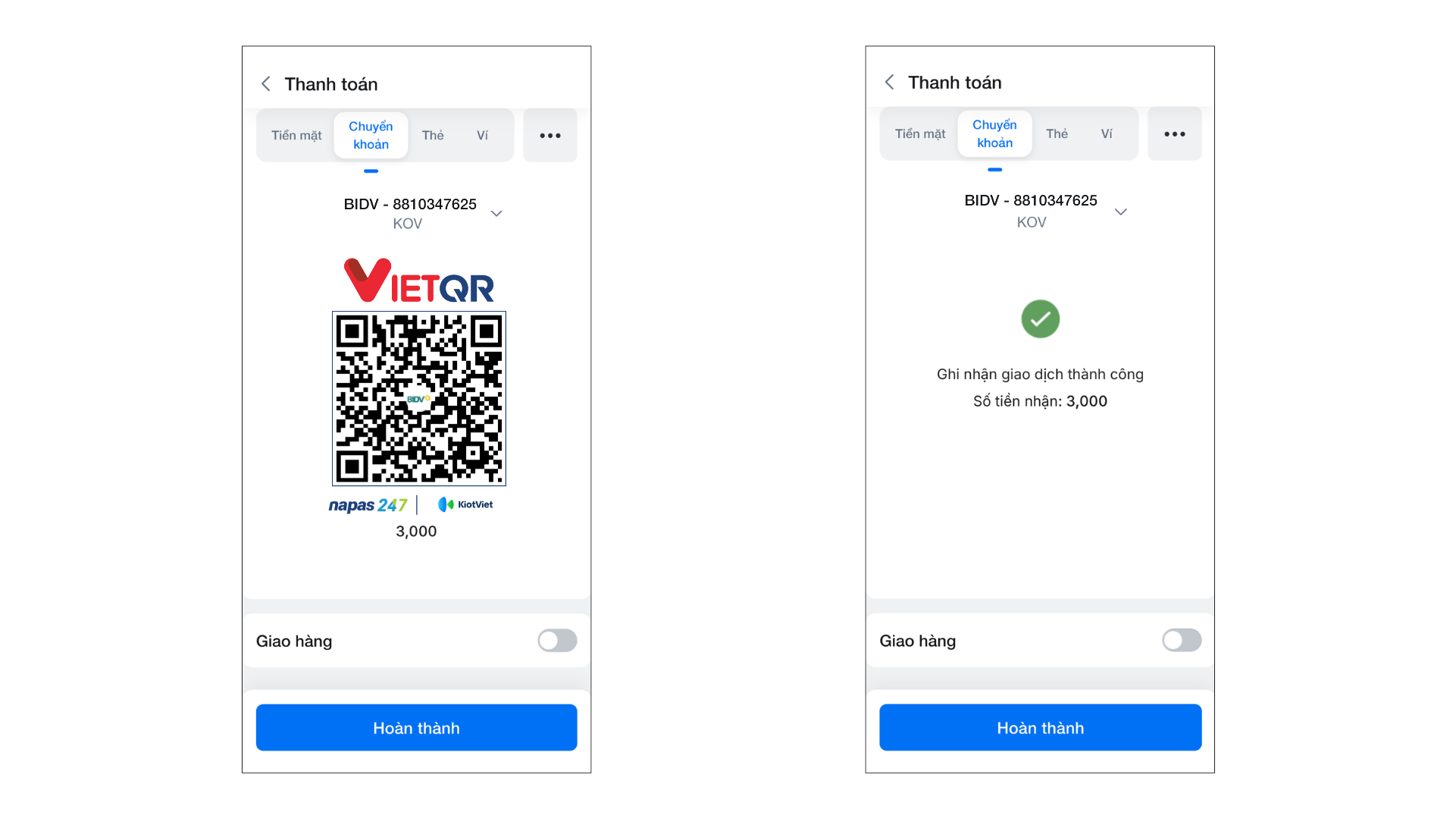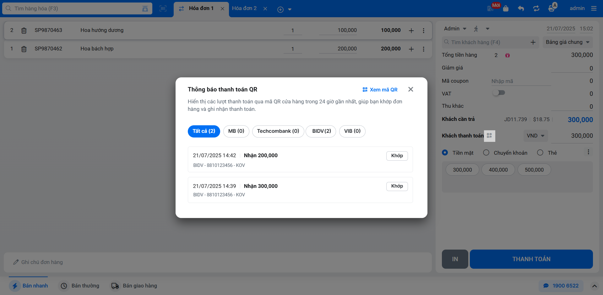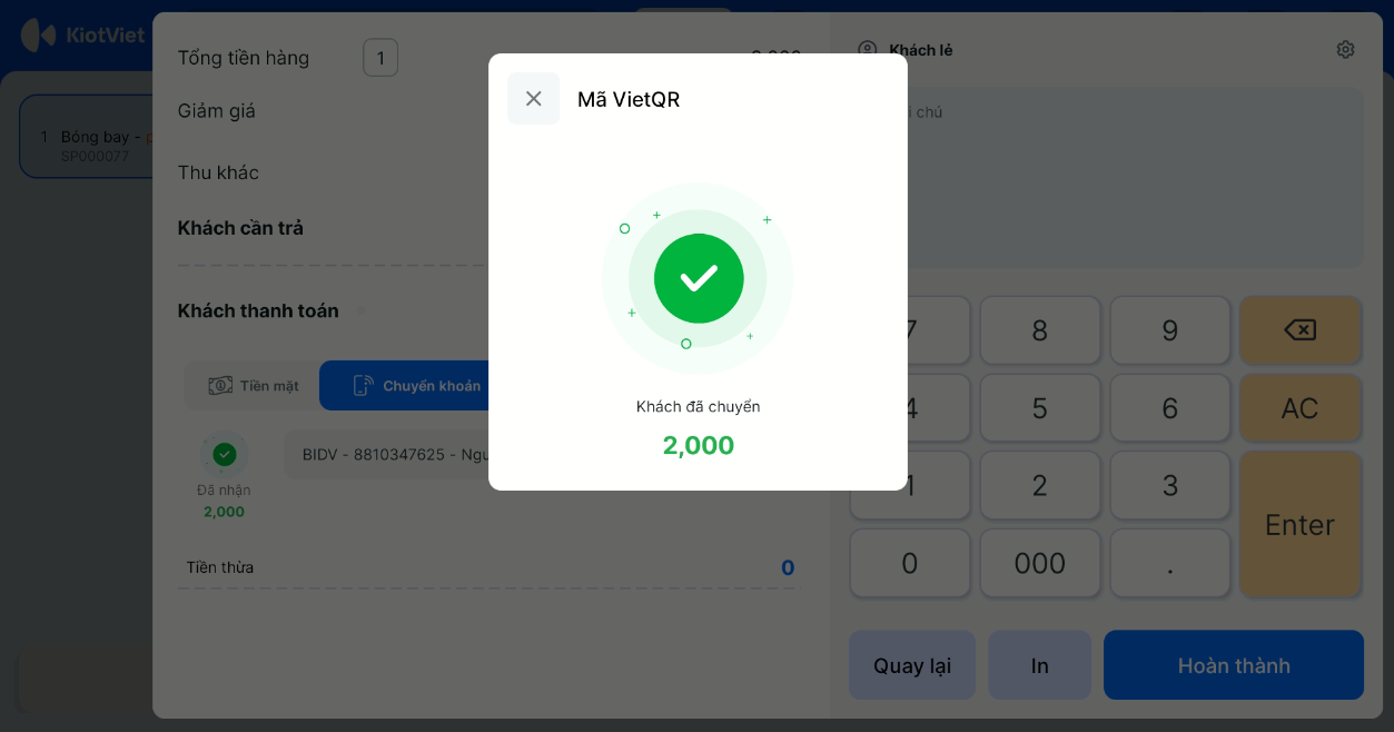 - Sau khi khách hàng quét mã và chuyển khoản thành công, màn hình Bán hàng sẽ ngay lập tức hiển thị thông báo kết quả giao dịch.