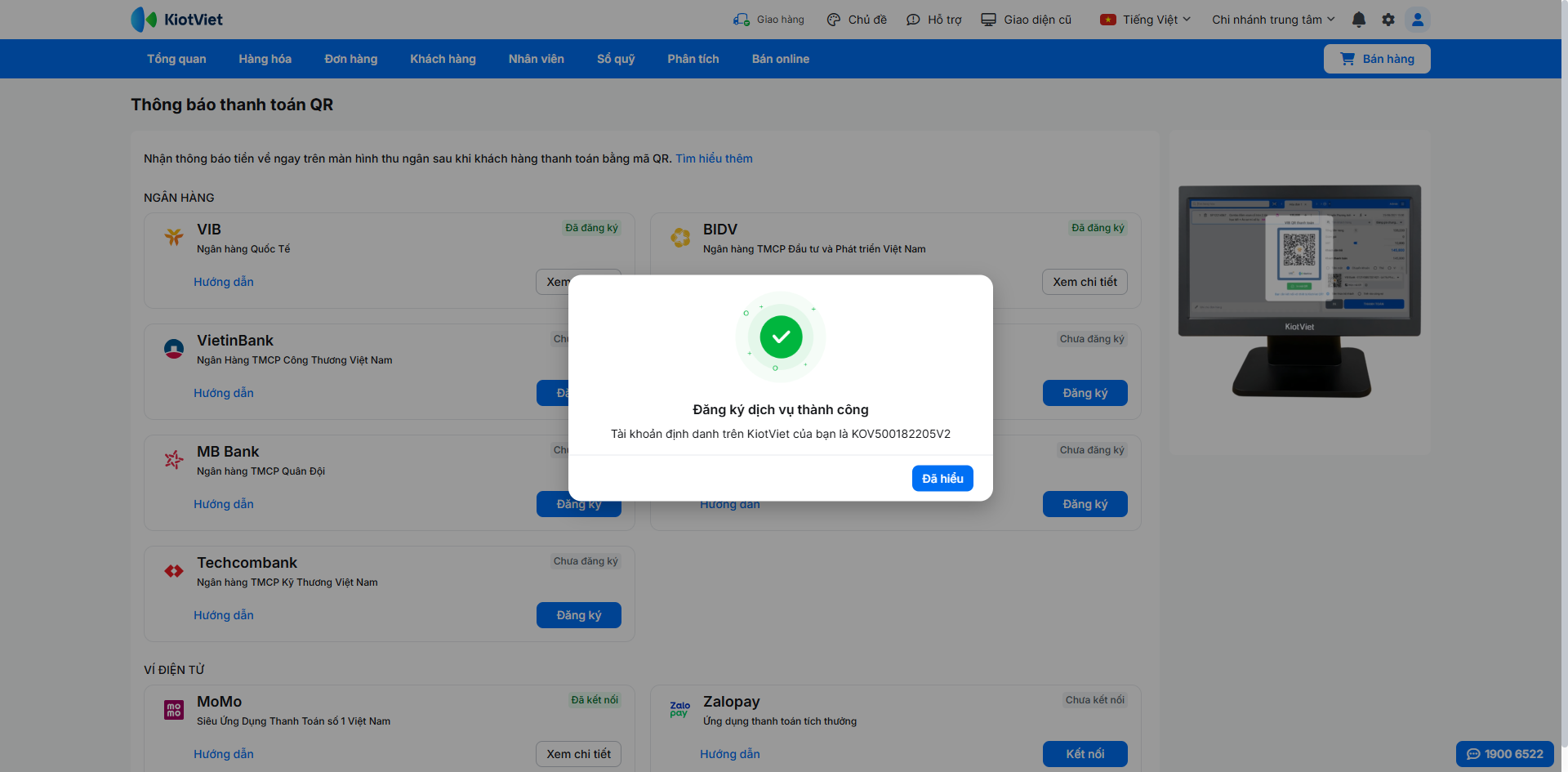 Khi khách hàng thực hiện thanh toán, hệ thống sẽ tự động hiển thị kết quả ngay trên màn hình Bán hàng để bạn xác nhận.