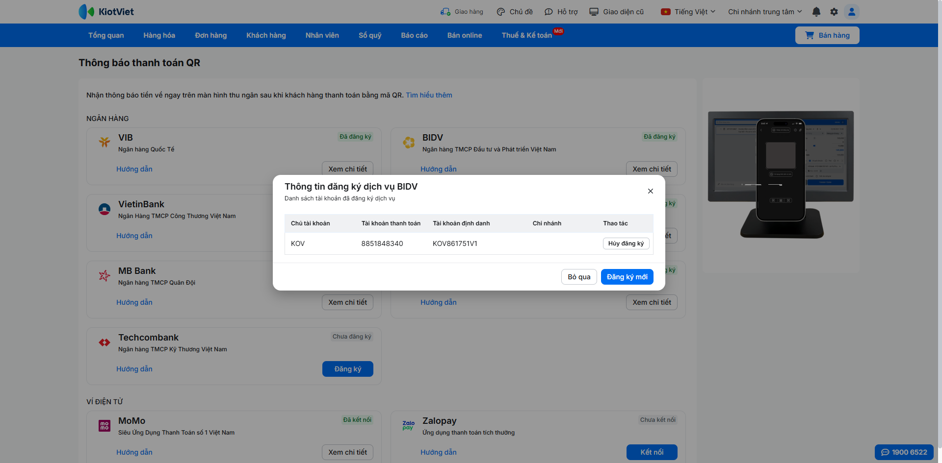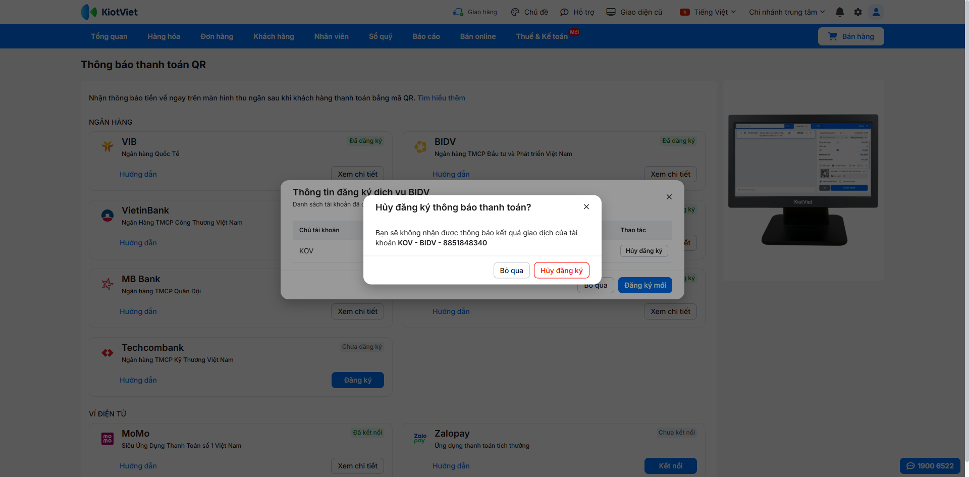 - Tình huống: Khi bạn cần kiểm tra lại thông tin các tài khoản BIDV nào đang được kết nối để nhận thông báo tự động trên KiotViet.