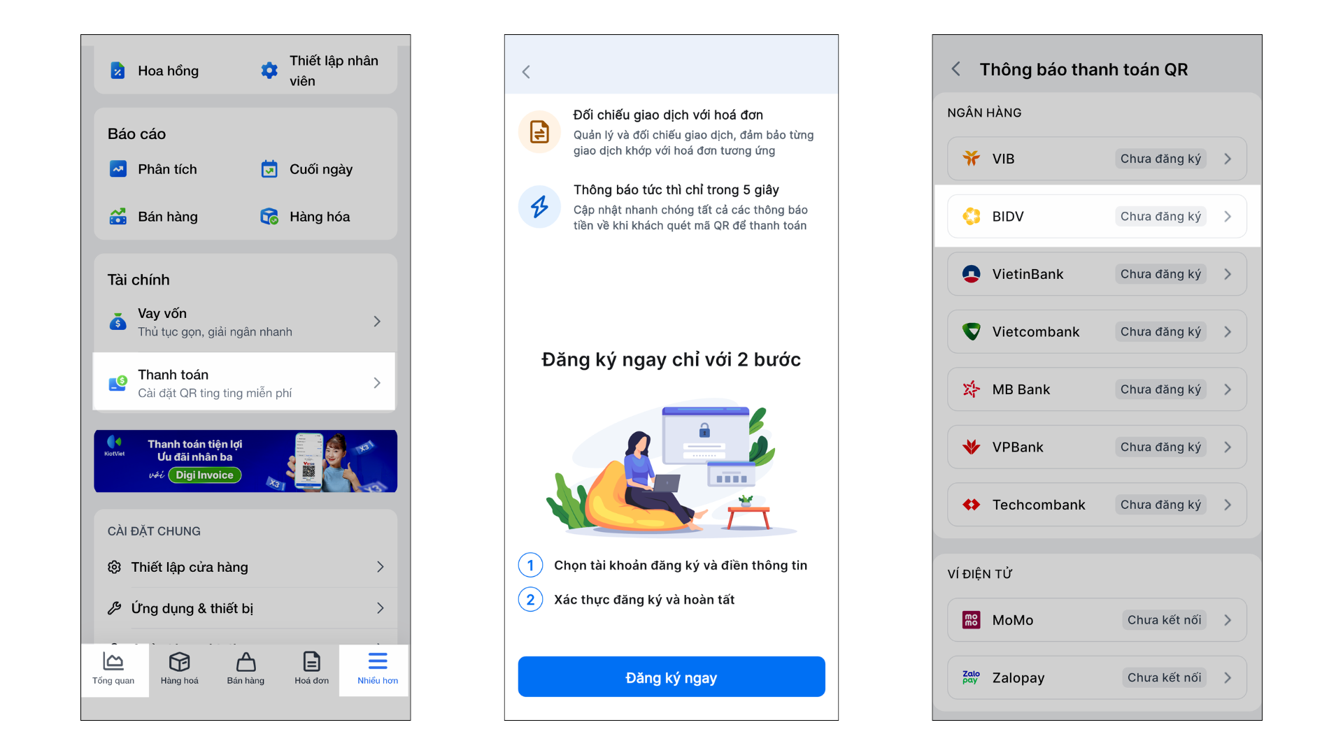 – Từ menu Nhiều hơn hoặc Tổng quan, bạn chọn mục Thanh toán -> nhấn Đăng ký ngay → Chọn thẻ BIDV.