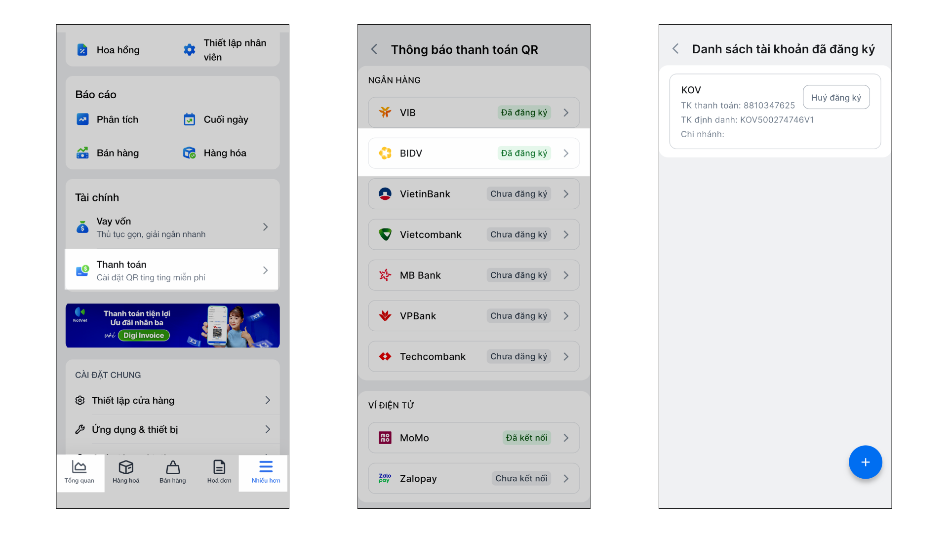 - Một gian hàng KiotViet có thể liên kết với nhiều tài khoản BIDV.