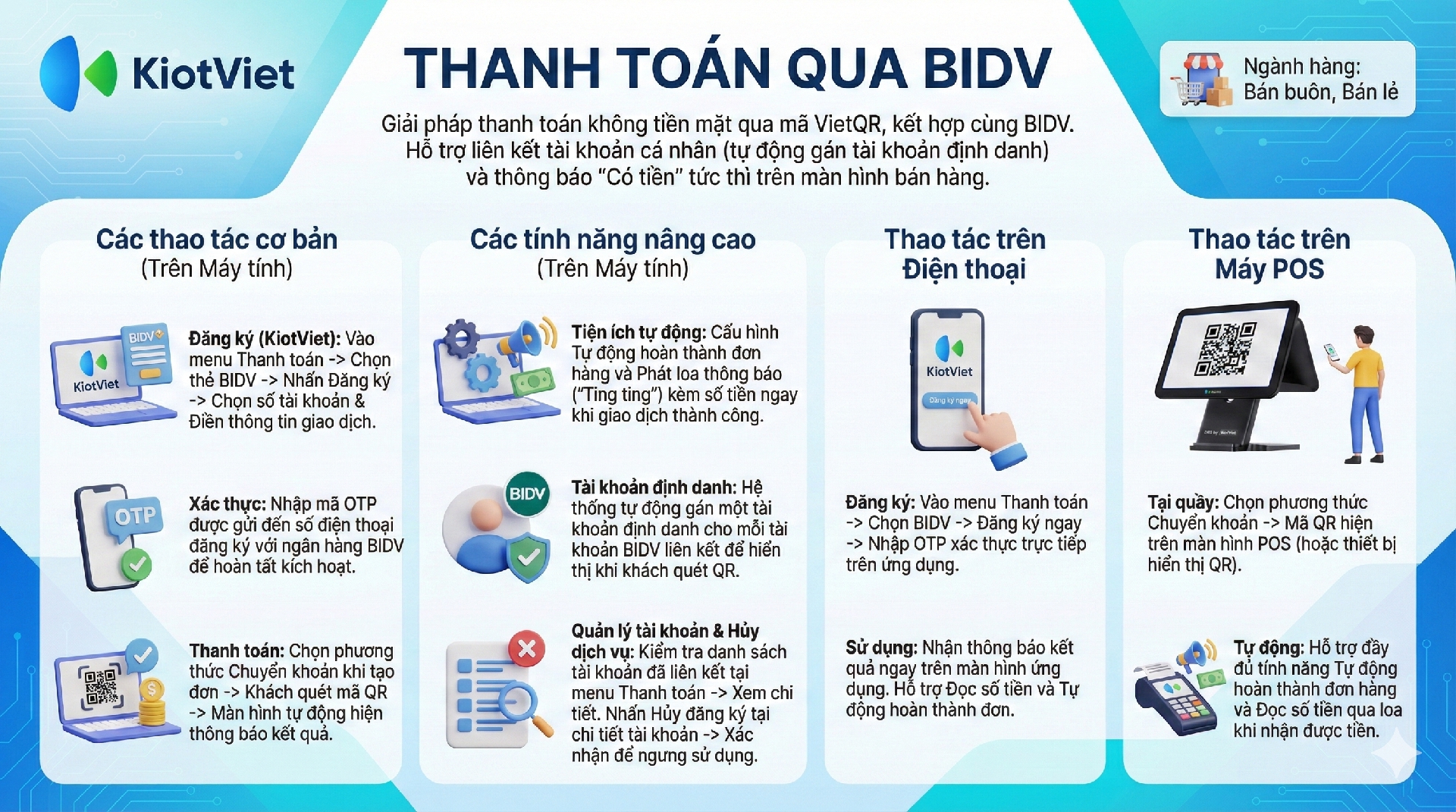 - Đối tượng áp dụng: Tất cả gian hàng trên KiotViet (bao gồm cả gian hàng dùng thử và gian hàng chính thức) có tài khoản tại ngân hàng BIDV.