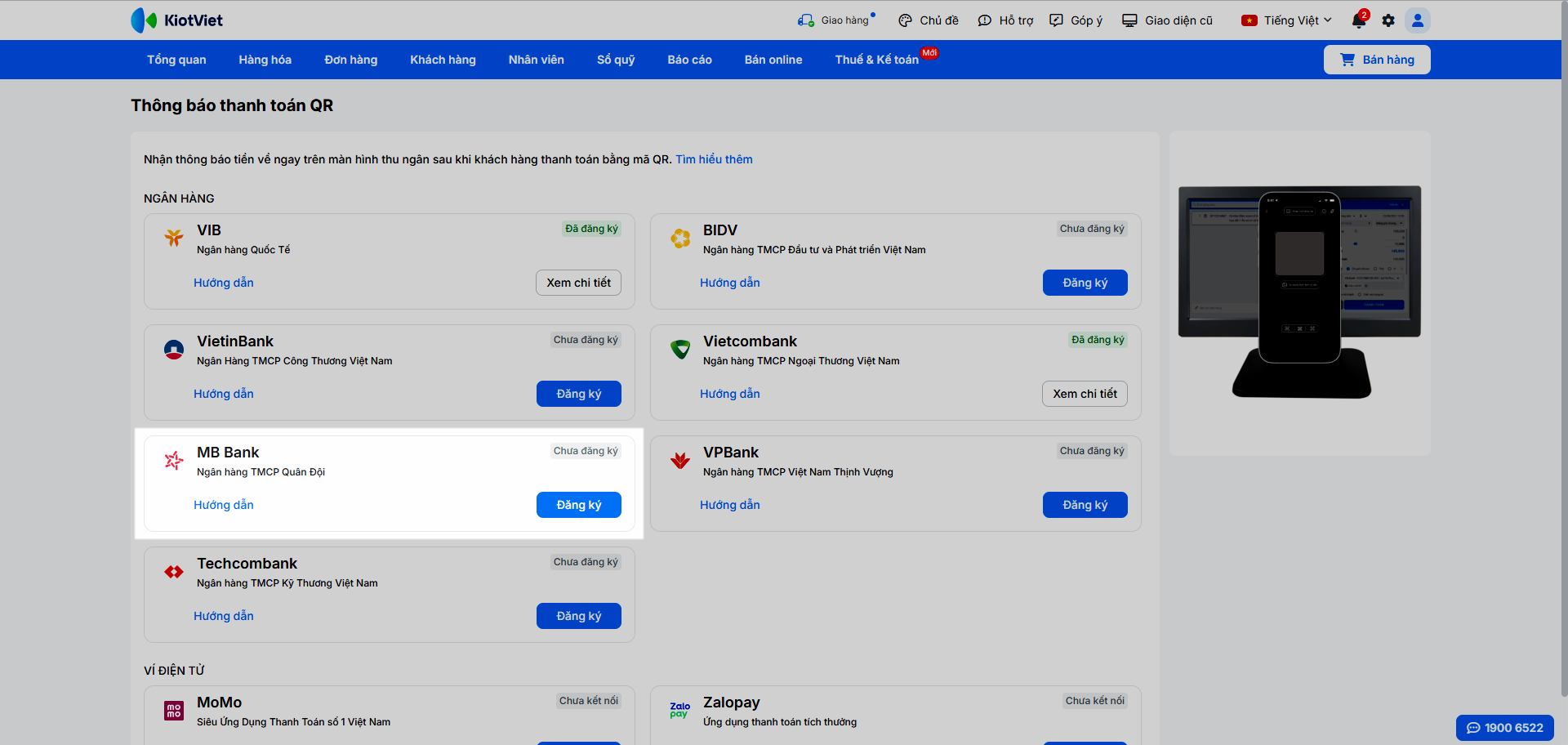 Nhằm hỗ trợ các gian hàng thúc đẩy việc thanh toán phi tiền mặt, KiotViet kết hợp cùng ngân hàng MB Bank đã ra mắt tính năng thanh toán chuyển khoản bằng phương pháp quét mã VietQR và nhận thông báo kết quả ngay trên phần mềm.