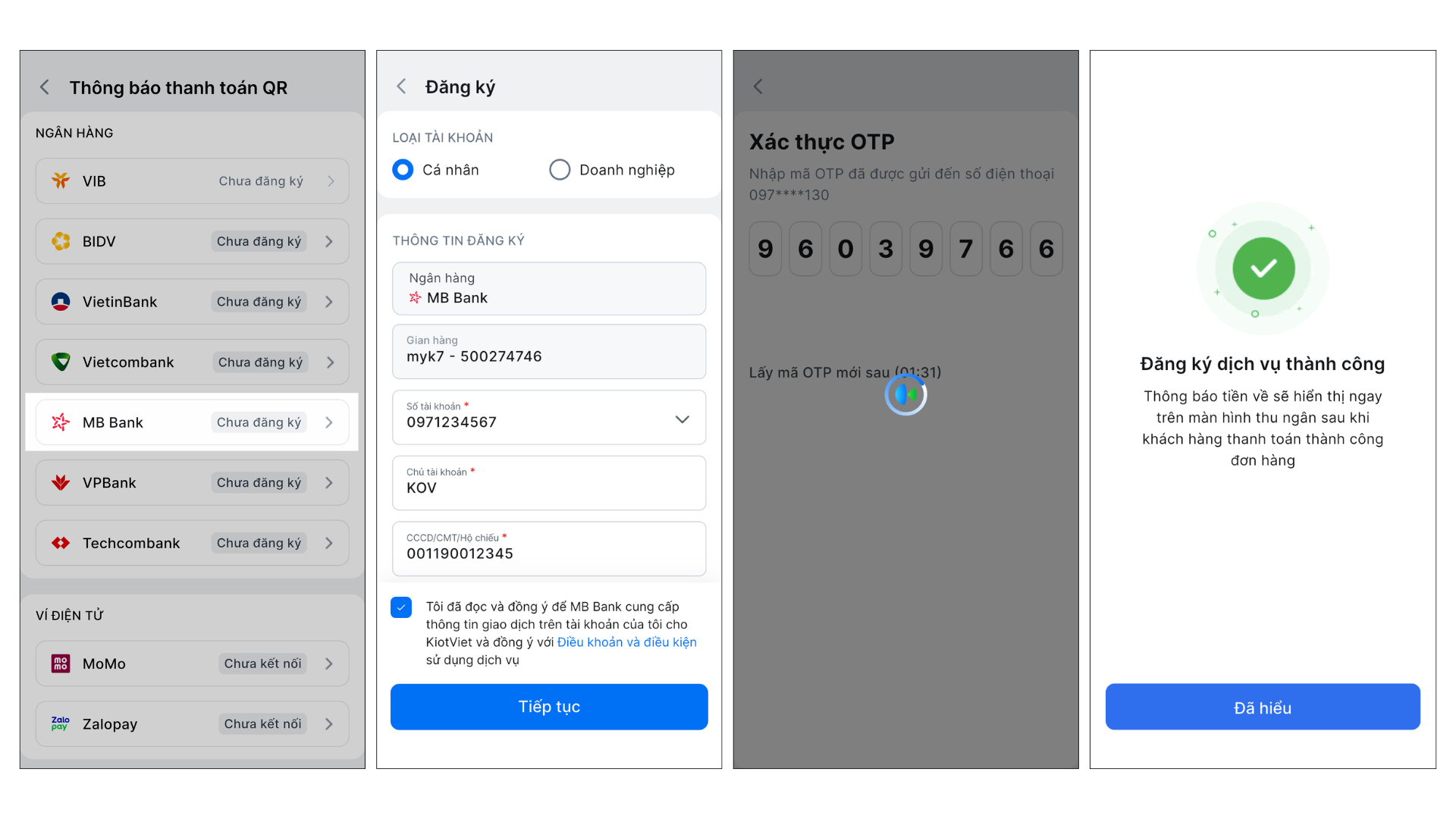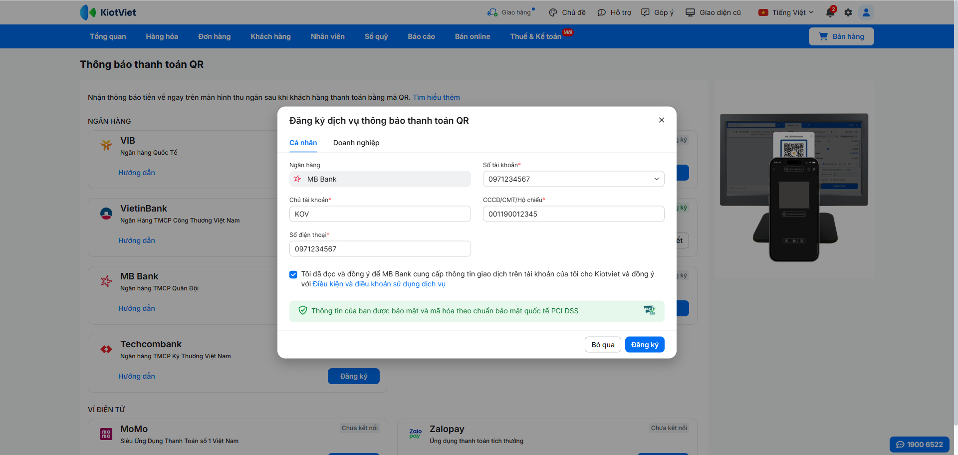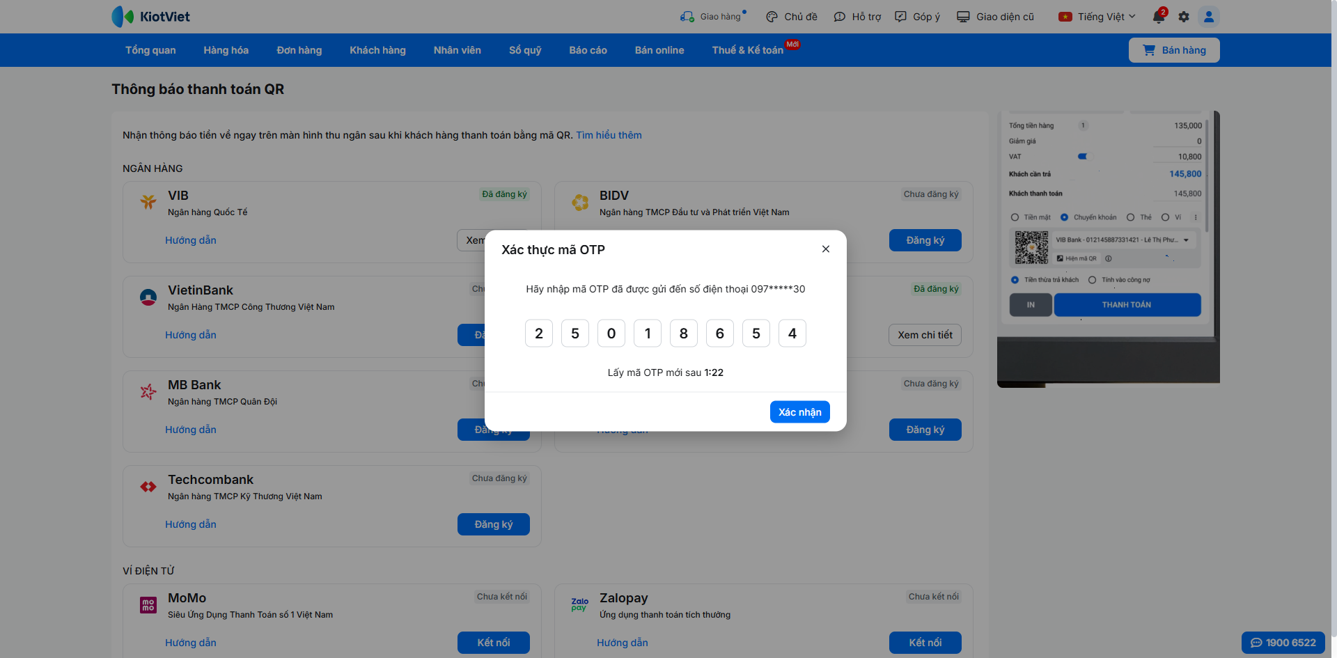 Để kích hoạt tính năng nhận thông báo thanh toán tự động, bạn cần đăng ký dịch vụ trực tiếp trên phần mềm KiotViet và xác thực bằng mã OTP.