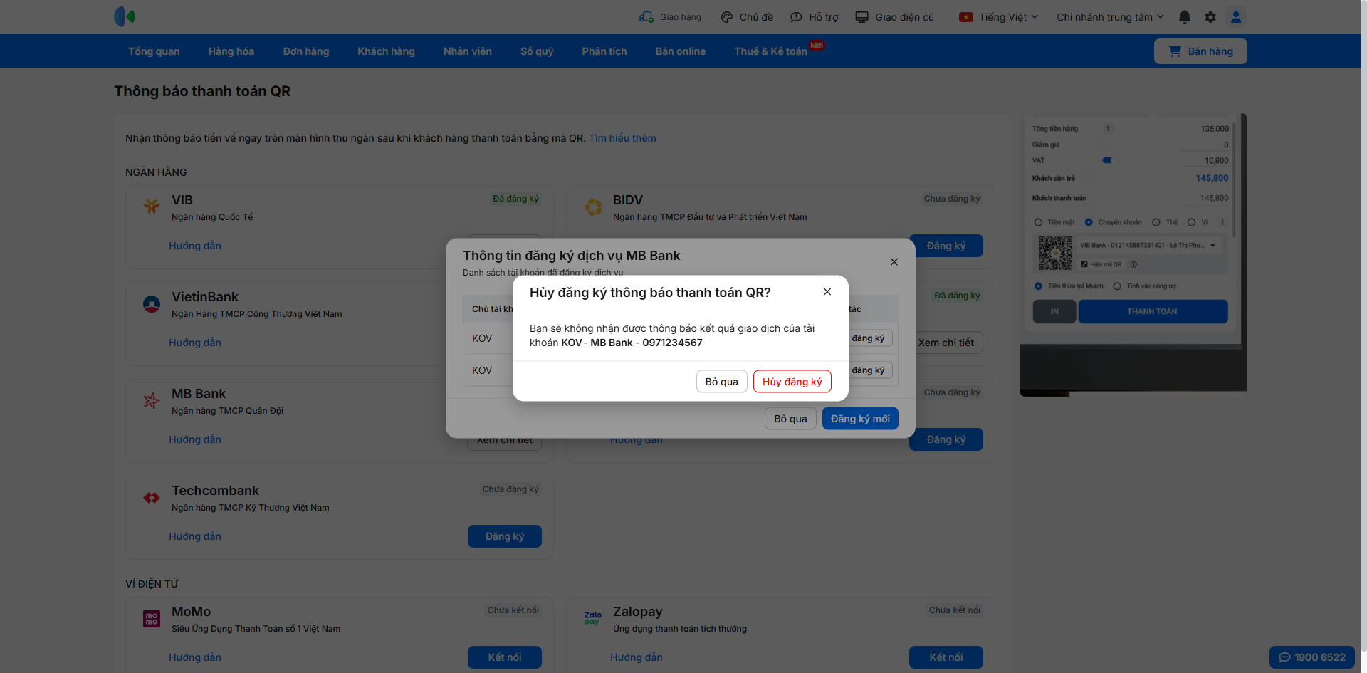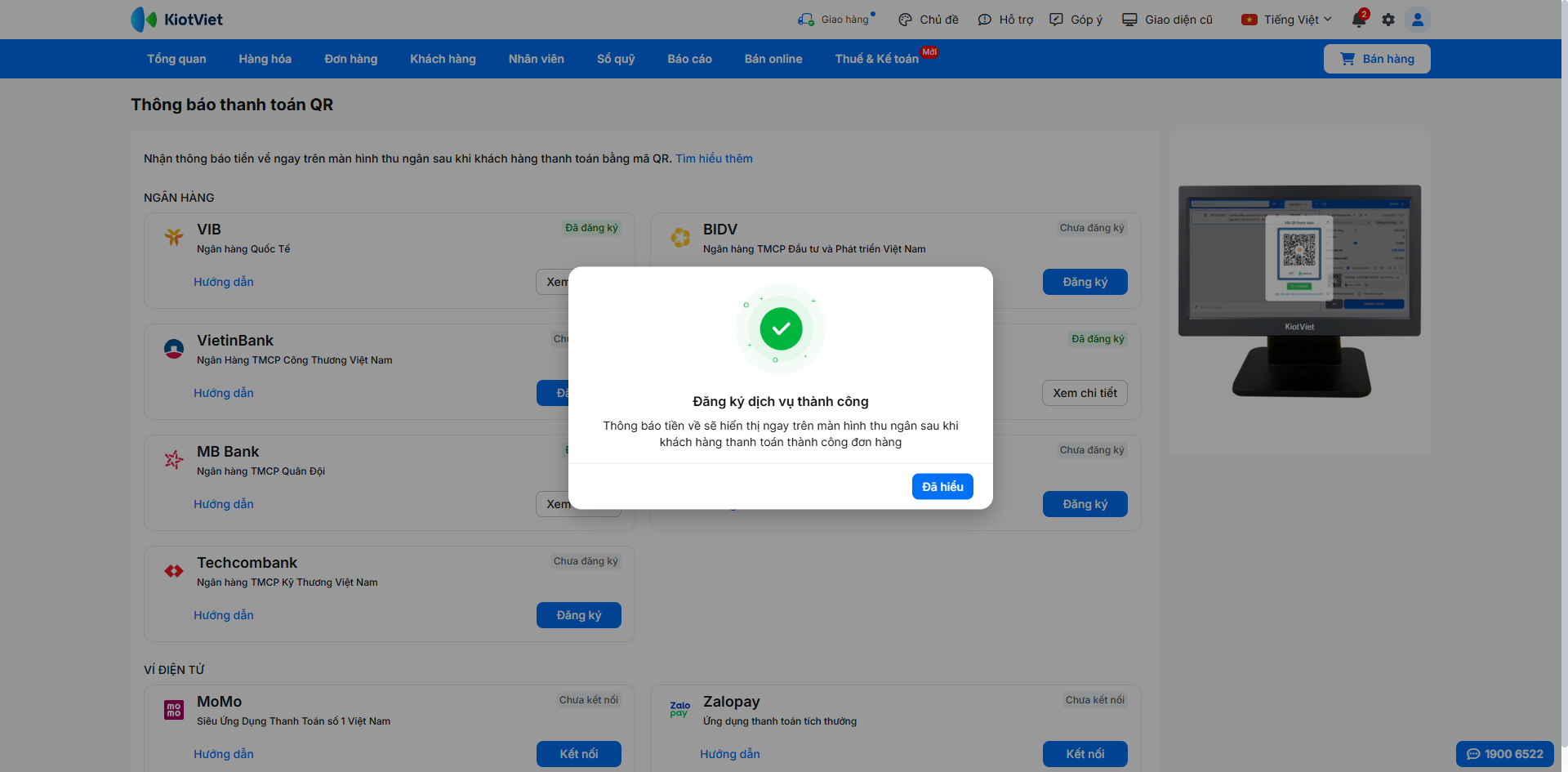 Khi khách hàng thực hiện thanh toán, hệ thống sẽ tự động hiển thị kết quả ngay trên màn hình Bán hàng để bạn xác nhận.