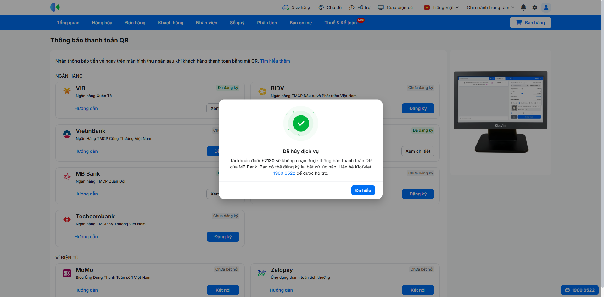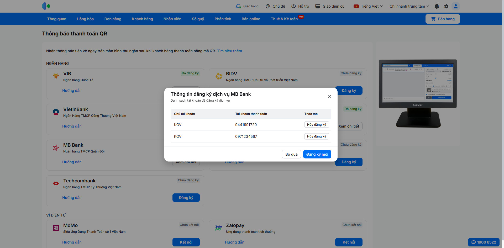 - Tình huống: Khi bạn cần kiểm tra lại thông tin các tài khoản MB Bank nào đang được kết nối để nhận thông báo tự động trên KiotViet.