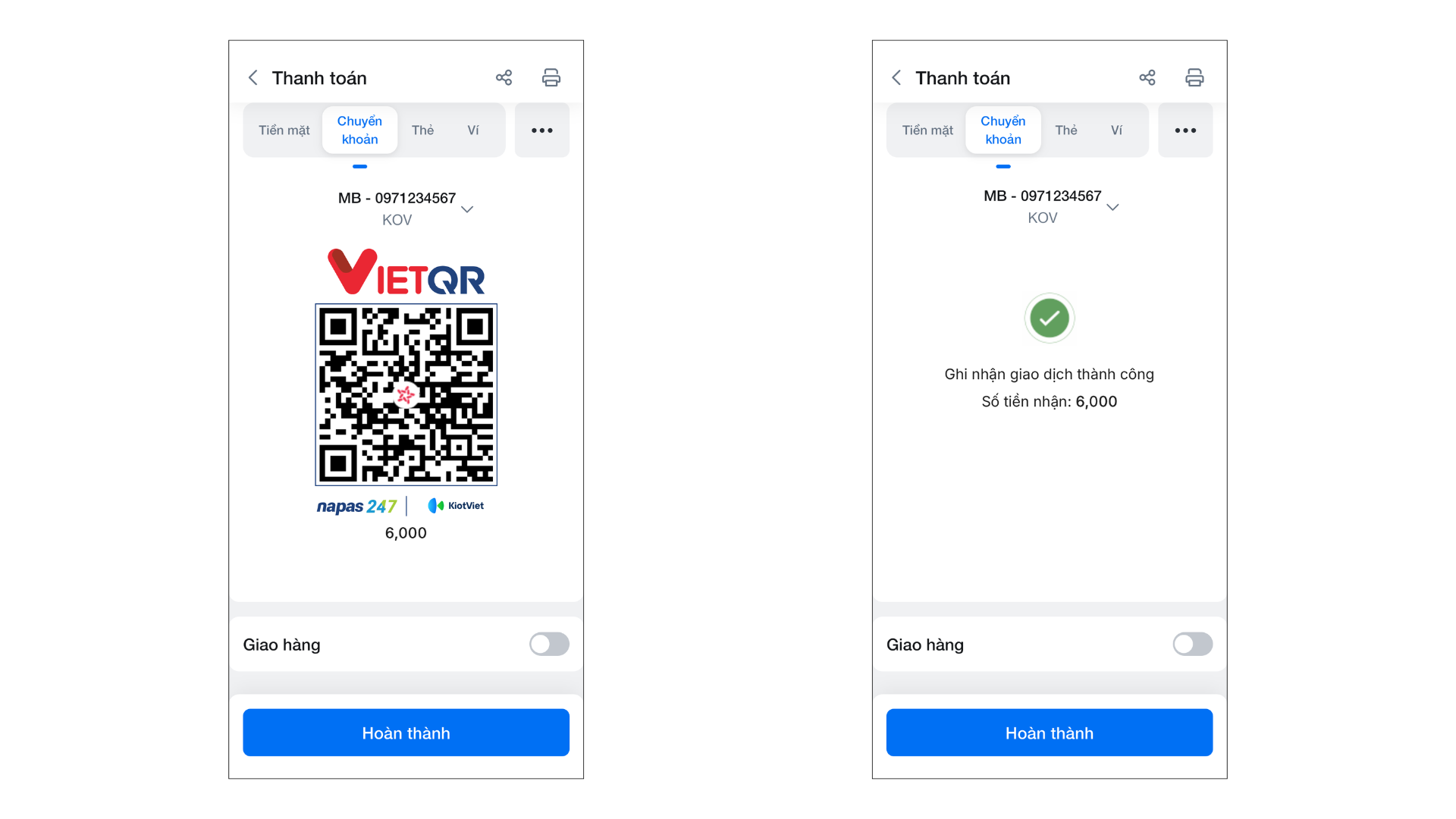 - Sau khi khách hàng quét mã và chuyển khoản thành công, màn hình Bán hàng sẽ ngay lập tức hiển thị thông báo kết quả giao dịch.