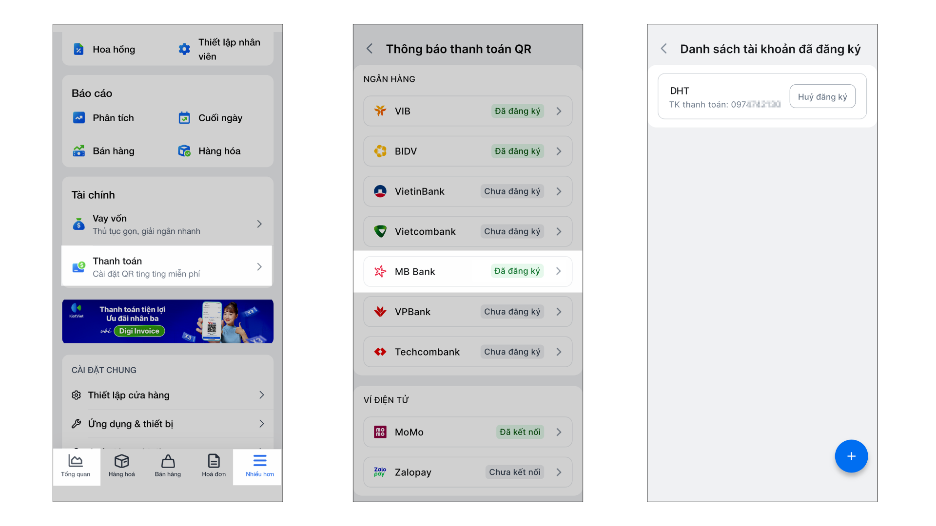 - Giúp chủ cửa hàng và quản lý: Dễ dàng đăng ký và quản lý nhiều tài khoản MB Bank trên cùng một gian hàng, giúp việc đối soát và theo dõi dòng tiền trở nên đơn giản và tập trung.