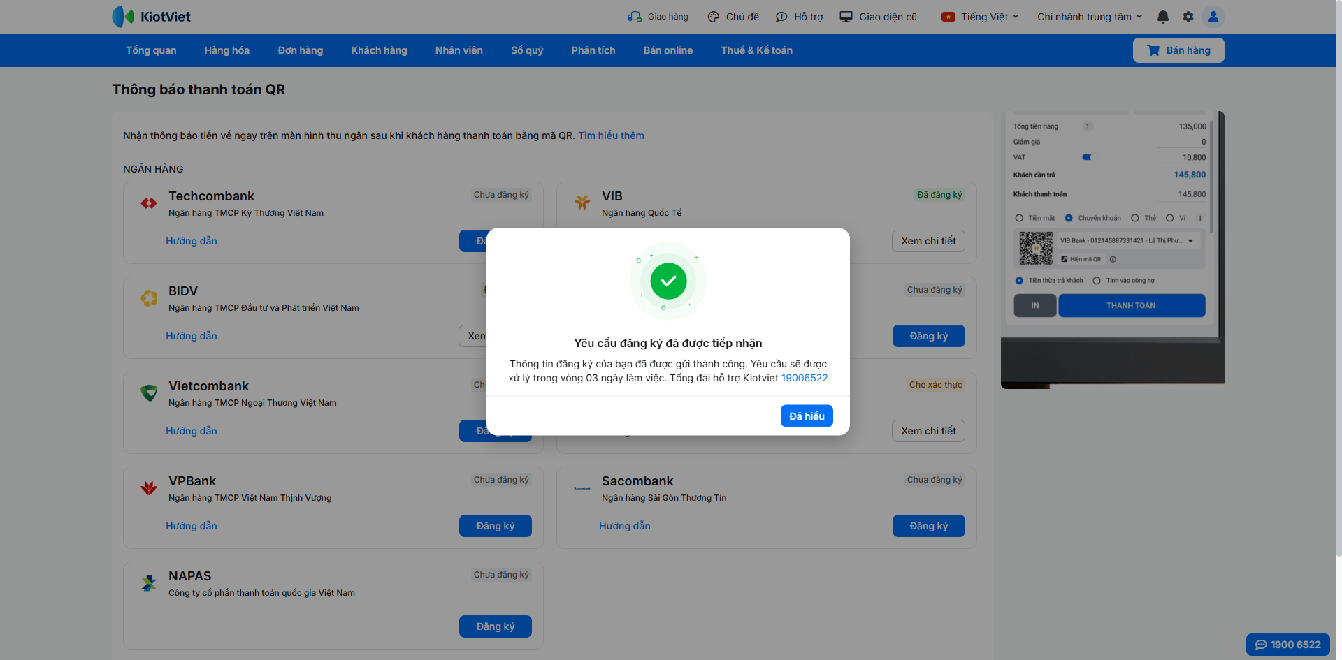 - Tình huống: Khi khách hàng thực hiện thanh toán, hệ thống sẽ tự động hiển thị kết quả ngay trên màn hình Bán hàng để bạn xác nhận.