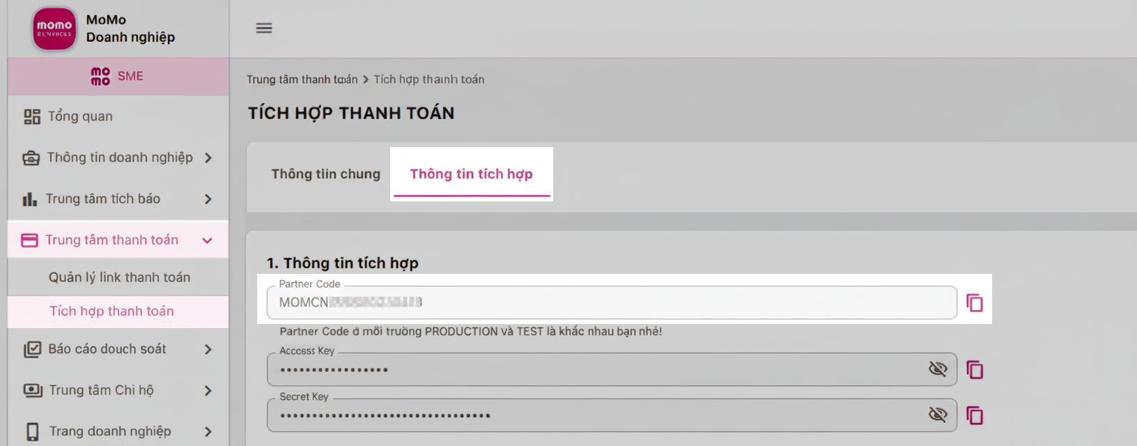 - Partner code: Bạn lấy thông tin trong Trung tâm thanh toán -> Tích hợp thanh toán -> Thông tin tích hợp