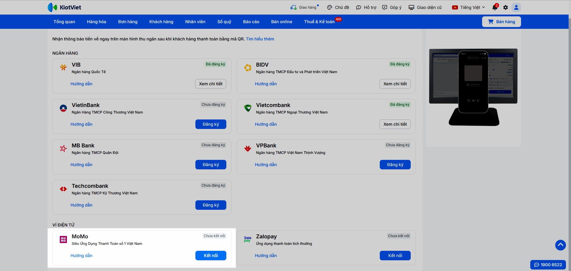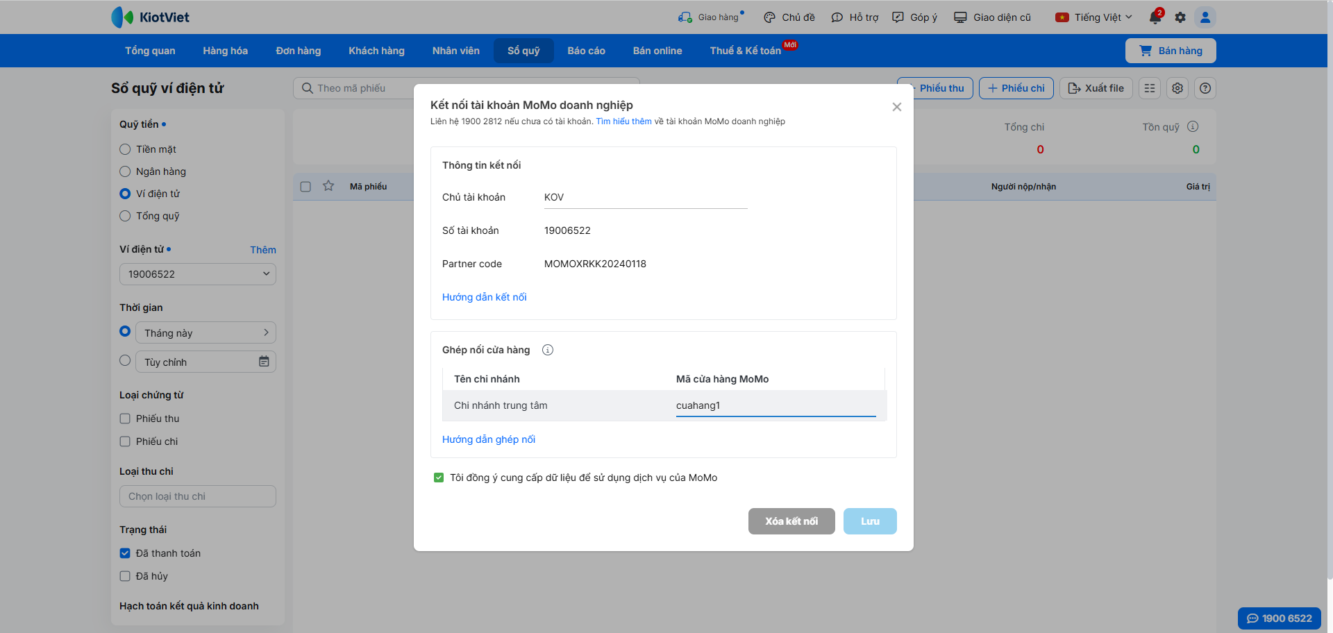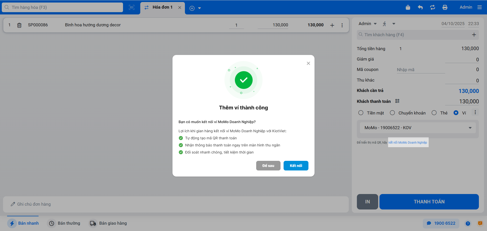 - Hoặc ngay sau khi Lưu thông tin thêm Ví MoMo thành công trên màn hình Sổ quỹ/ màn hình Bán hàng, bạn chọn Kết nối