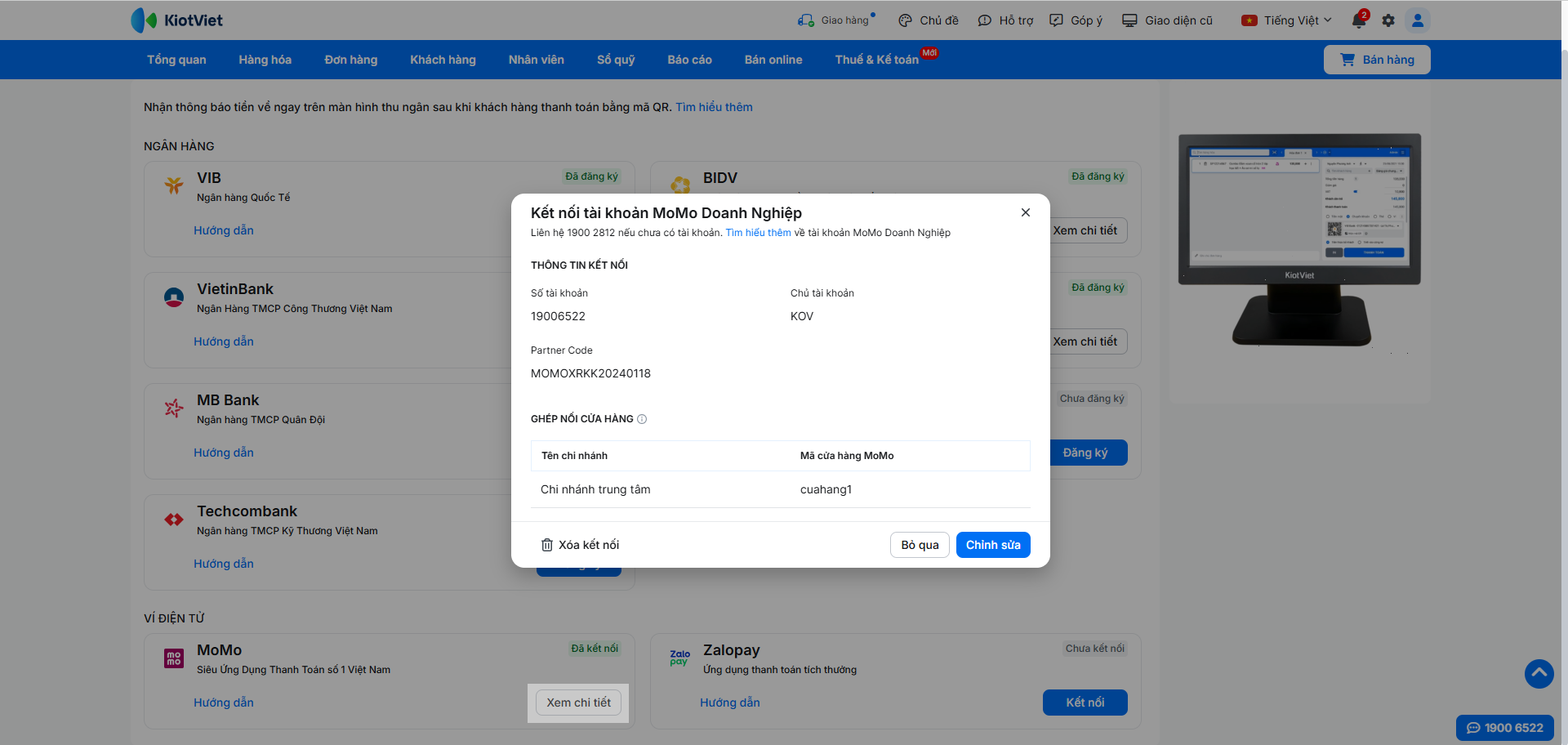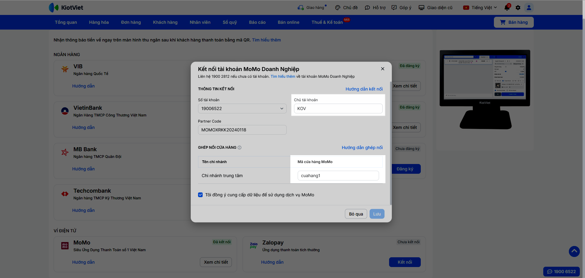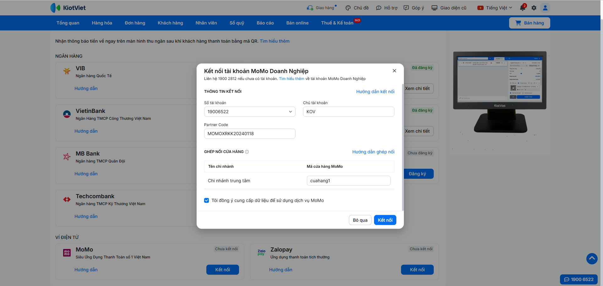 Để kích hoạt tính năng, bạn cần lấy thông tin từ tài khoản MoMo Business và điền vào phần thiết lập trên KiotViet.