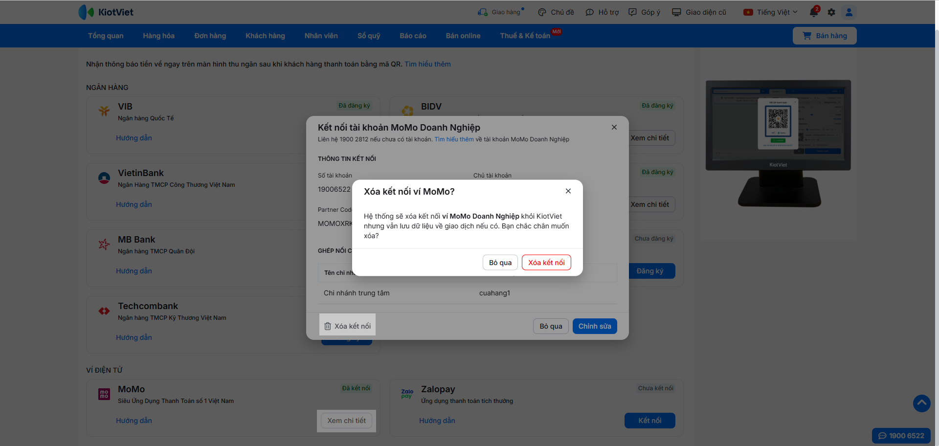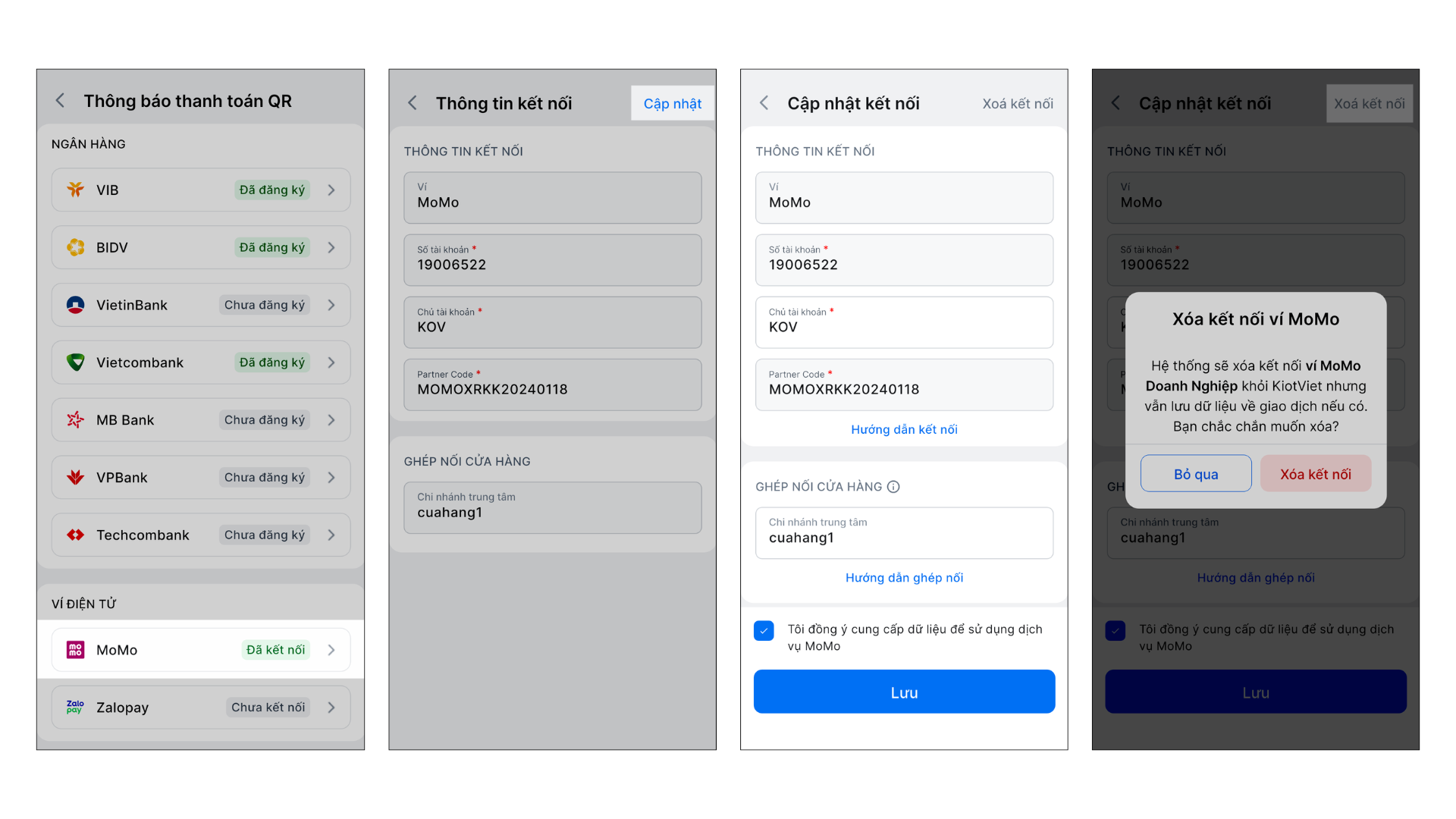 - Để thay đổi Số tài khoản và Partner code, bạn cần xóa kết nối hiện tại và thực hiện kết nối lại từ đầu.