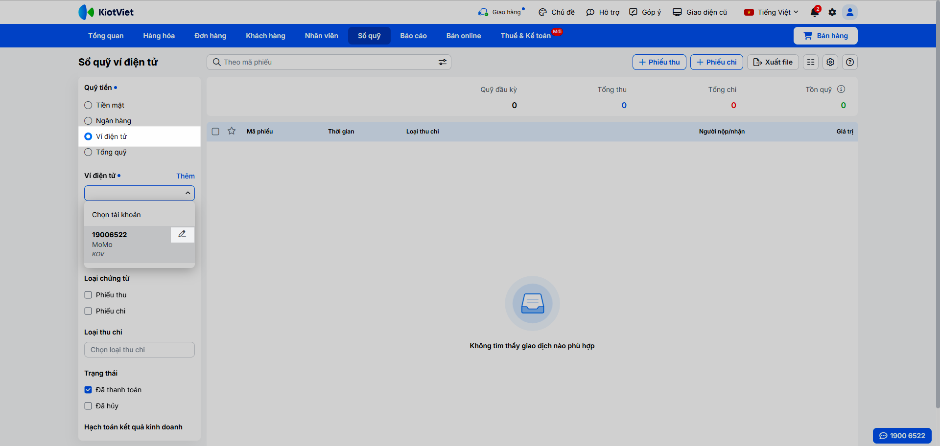Ngoài ra, hệ thống còn hỗ trợ thao tác chỉnh sửa thông tin trên màn hình Sổ quỹ. Bạn chọn Ví điện tử -> tài khoản MoMo -> kích biểu tượng cây bút